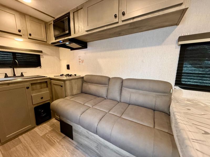 You'll love camping in this cozy trailer! Once you arrive at the campground, you can set up the 9' power awning and head inside to unpack your bags. After you've stretched your legs on a hike, the rear corner private bath with a 24" x 32" shower and a toilet will let you freshen up. You'll find the kitchen in the other rear corner, complete with a two burner cooktop, a double sink, plus counter space to prep meals. When you're ready for some shut-eye, the front 54" x 74" full-size bed will provide a great night's rest, while your guest takes the 56" jiffy sofa!