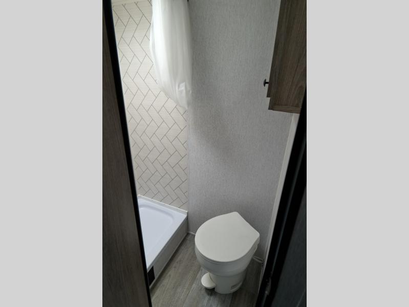 If you've been wanting to ditch that old tent and upgrade to a travel trailer, this easy-to-tow unit is the one! You will have a front RV queen bed to sleep on instead of an air mattress or cot, and there are even bunk beds in the back for the little ones. The bathroom includes a shower and a toilet so you don't have to use the camp's facilities in the middle of the night, and there is a closet plus a shelf by the front bed for storage space. You will love having a kitchen to cook meals in that include a two burner stove, a 4.3 cu. ft. 12V refrigerator, plus a double sink for easy clean up. When dinner is ready, you can dine at the 30" booth dinette and play a game of cards when everything is cleaned up!