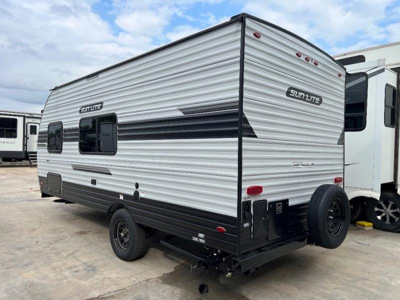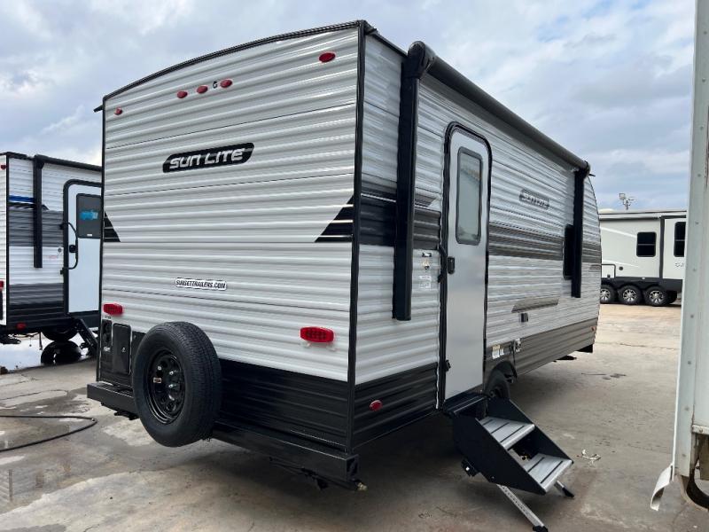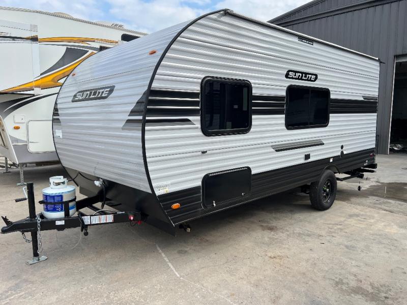 Each Sun Lite LTD travel trailer by Sunset Park RV is made with flexibility in mind. These lightweight models weigh under 3,000 lbs. for easy towing, and they offer best-in class interior storage for all your belongings. They are built with a one-piece PVC roof membrane and a durable rock guard that will help protect against rock and debris on the way to the campground. There is also an electric awning outside, along with a 100-watt solar kit, an outside shower, and more convenient features. You'll find a power roof vent in the bath, stylish window treatments, ball bearing drawer guides, and LED lights to name a few interior comforts.
