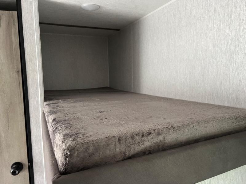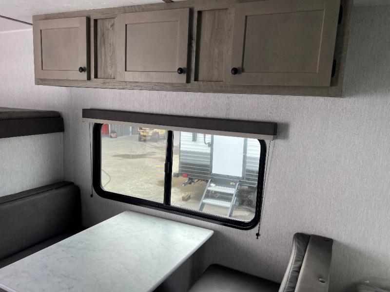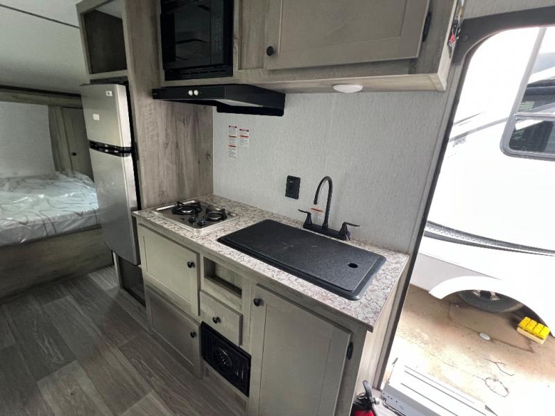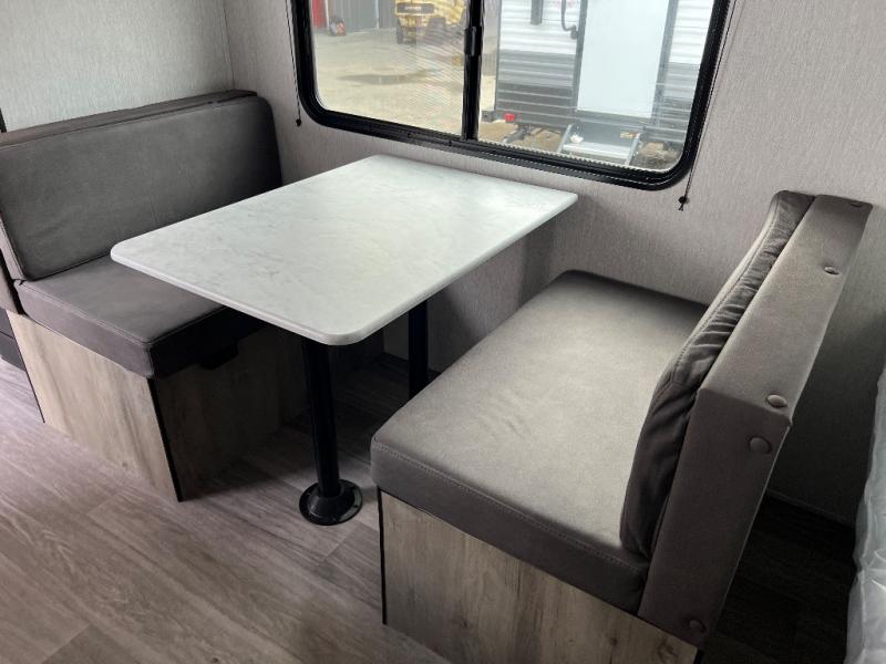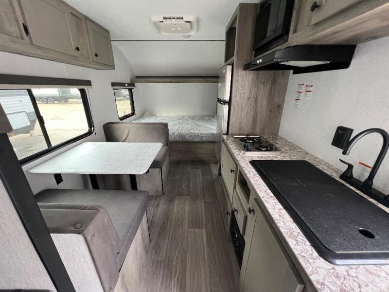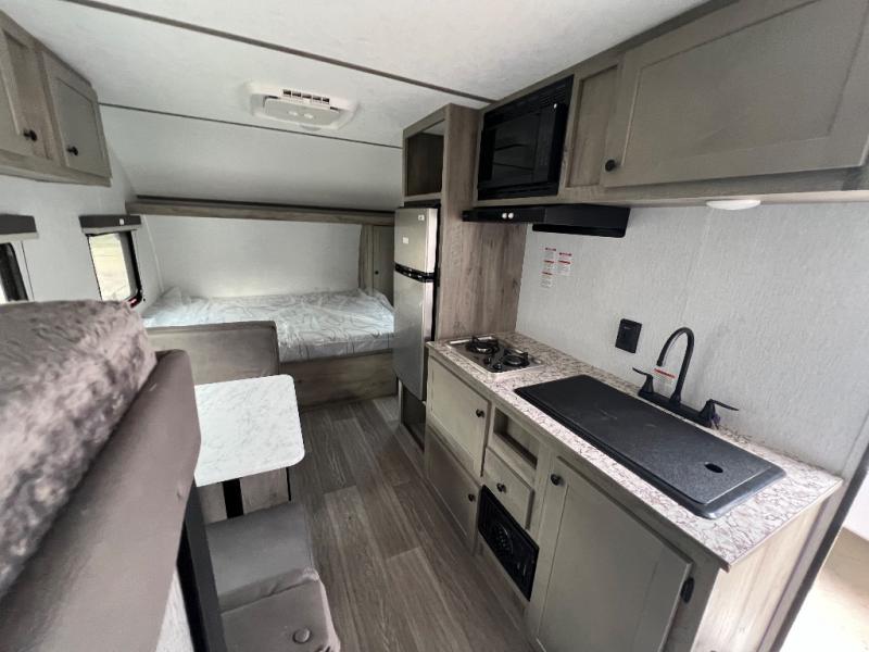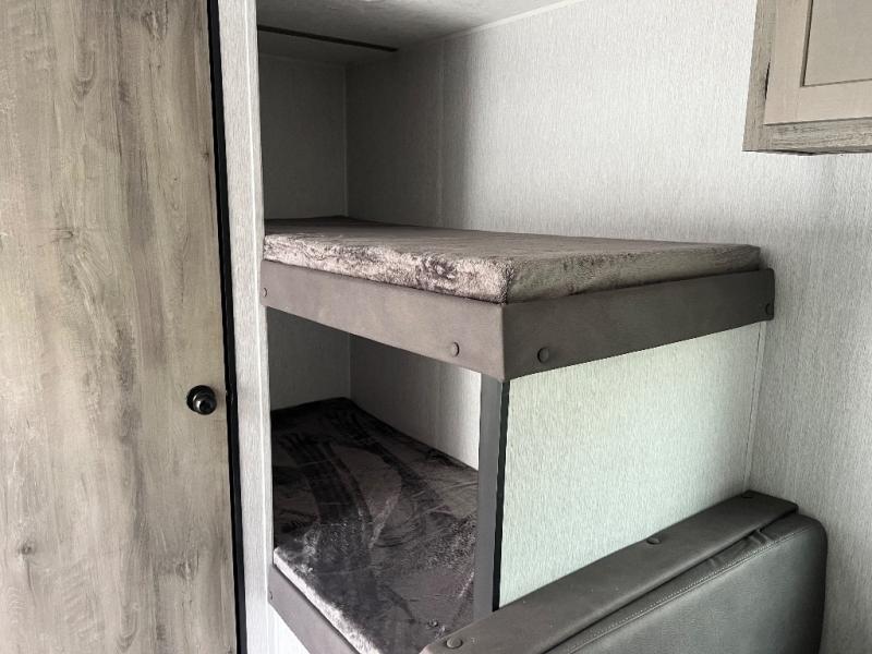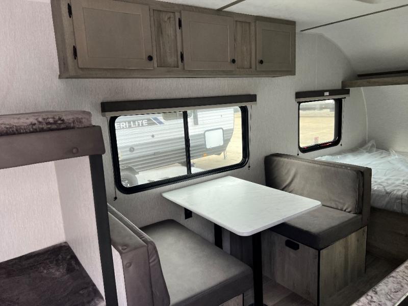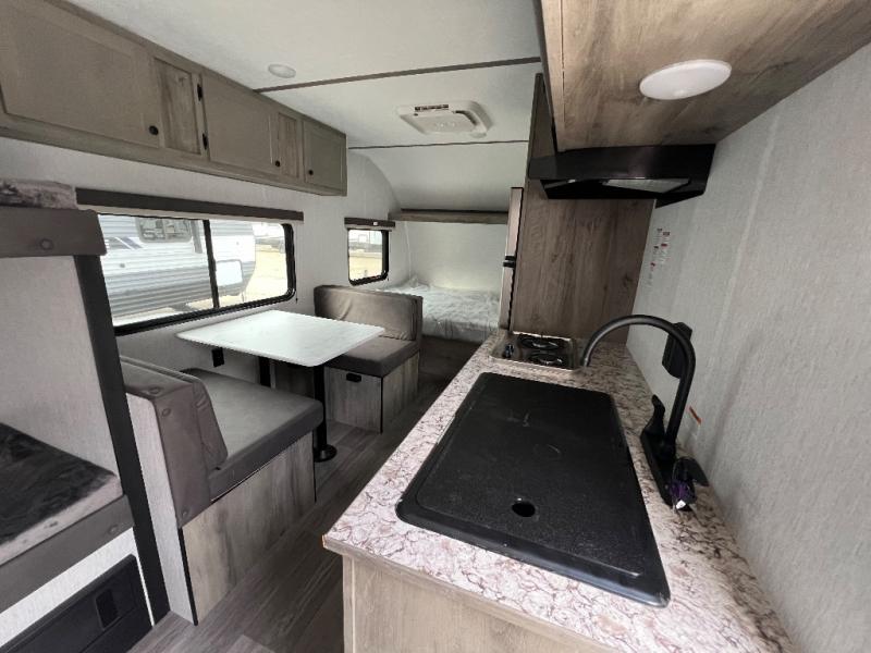 If you've been wanting to ditch that old tent and upgrade to a travel trailer, this easy-to-tow unit is the one! You will have a front RV queen bed to sleep on instead of an air mattress or cot, and there are even bunk beds in the back for the little ones. The bathroom includes a shower and a toilet so you don't have to use the camp's facilities in the middle of the night, and there is a closet plus a shelf by the front bed for storage space. You will love having a kitchen to cook meals in that include a two burner stove, a 4.3 cu. ft. 12V refrigerator, plus a double sink for easy clean up. When dinner is ready, you can dine at the 30" booth dinette and play a game of cards when everything is cleaned up!