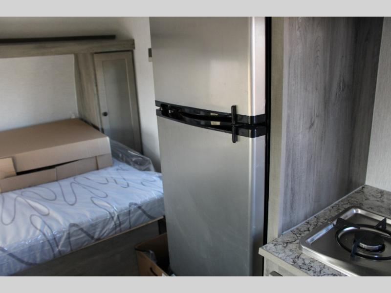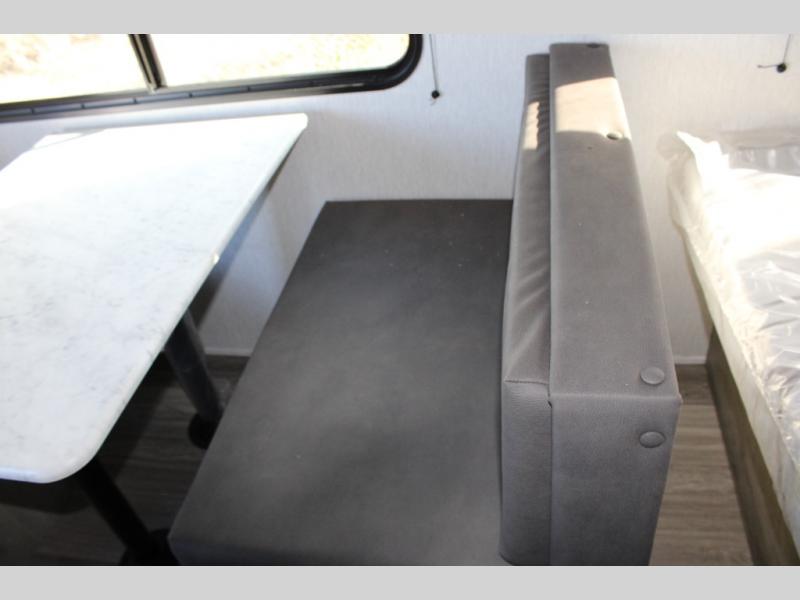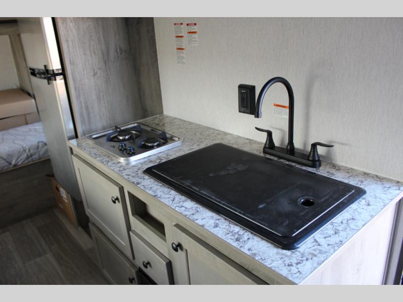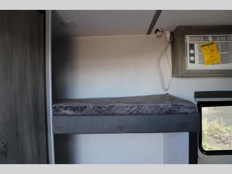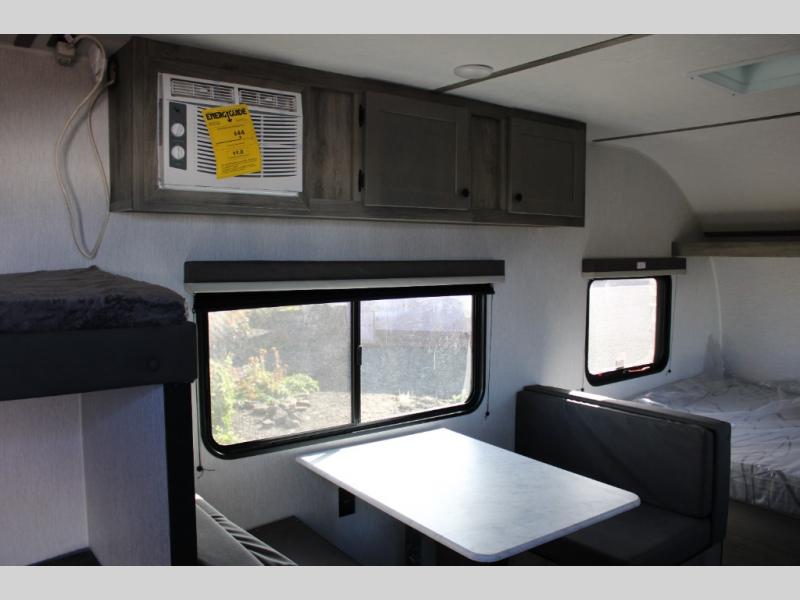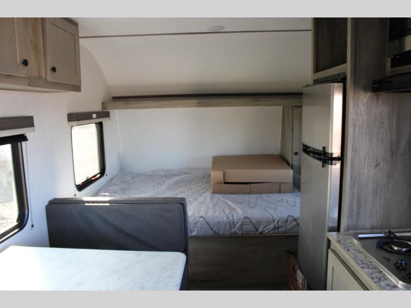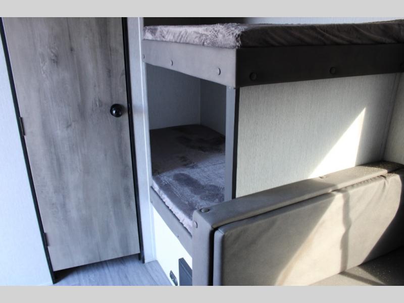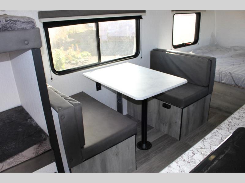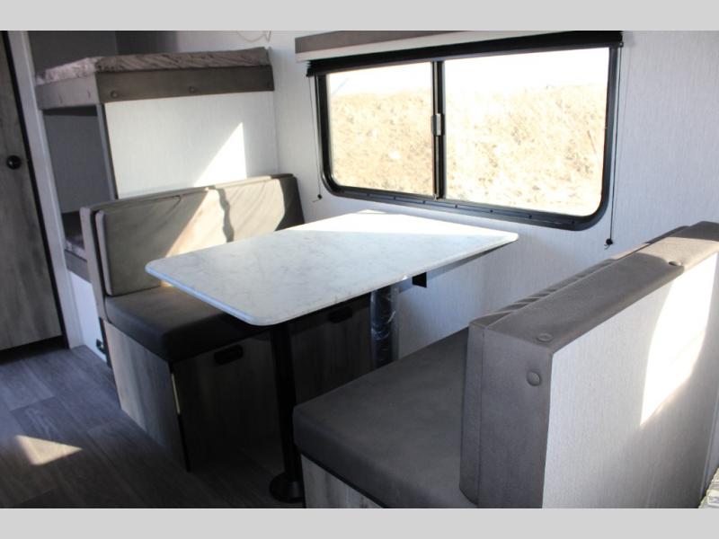 If you've been wanting to ditch that old tent and upgrade to a travel trailer, this easy-to-tow unit is the one! You will have a front RV queen bed to sleep on instead of an air mattress or cot, and there are even bunk beds in the back for the little ones. The bathroom includes a shower and a toilet so you don't have to use the camp's facilities in the middle of the night, and there is a closet plus a shelf by the front bed for storage space. You will love having a kitchen to cook meals in that include a two burner stove, a 4.3 cu. ft. 12V refrigerator, plus a double sink for easy clean up. When dinner is ready, you can dine at the 30" booth dinette and play a game of cards when everything is cleaned up!