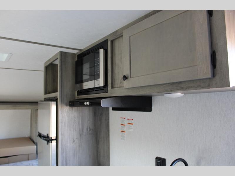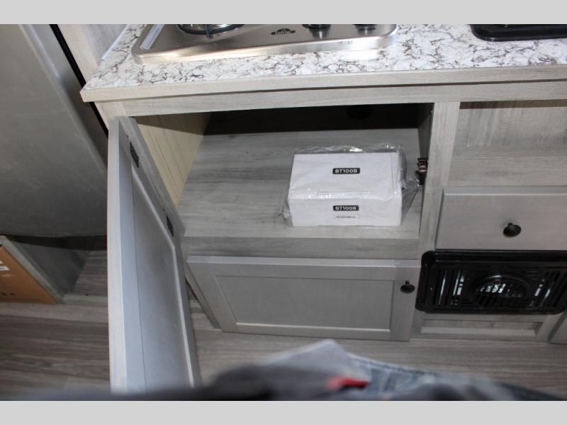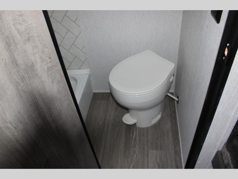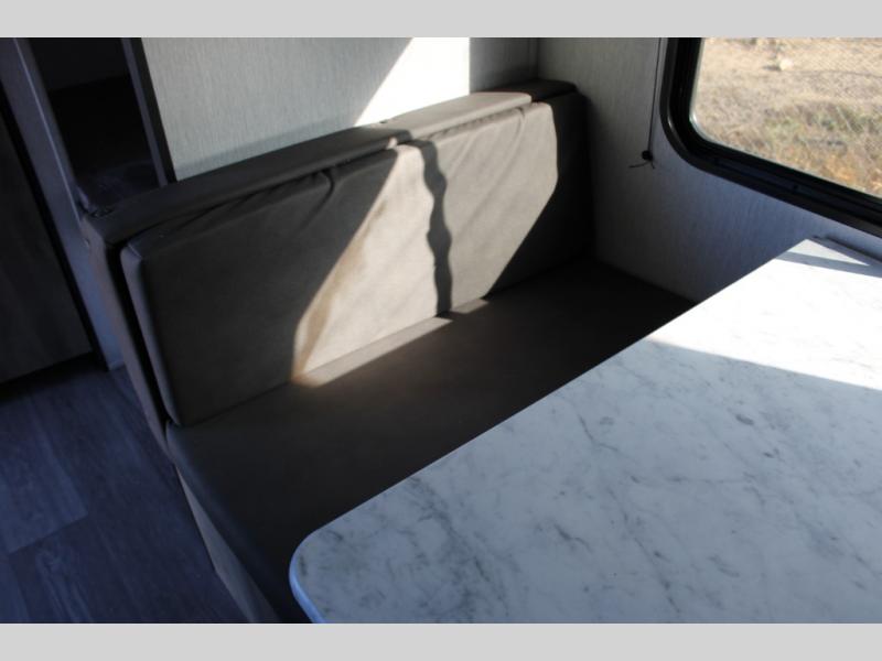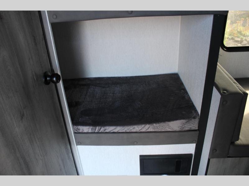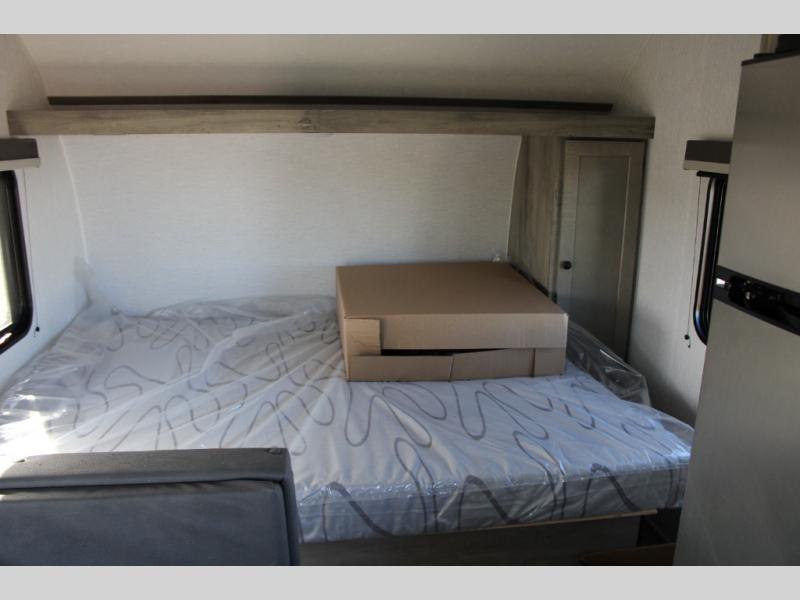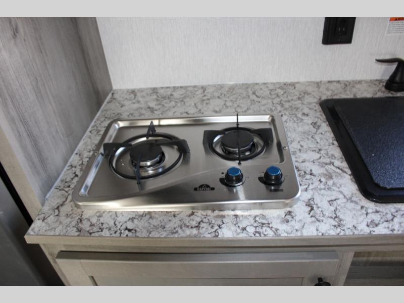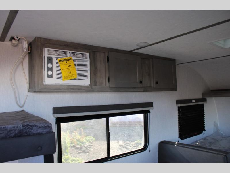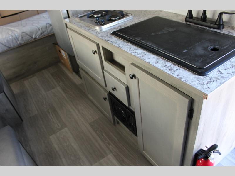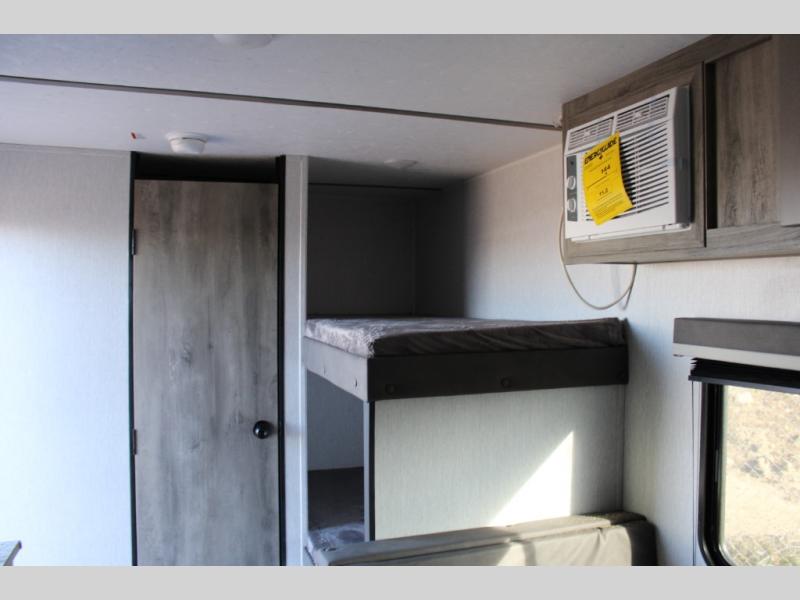 If you've been wanting to ditch that old tent and upgrade to a travel trailer, this easy-to-tow unit is the one! You will have a front RV queen bed to sleep on instead of an air mattress or cot, and there are even bunk beds in the back for the little ones. The bathroom includes a shower and a toilet so you don't have to use the camp's facilities in the middle of the night, and there is a closet plus a shelf by the front bed for storage space. You will love having a kitchen to cook meals in that include a two burner stove, a 4.3 cu. ft. 12V refrigerator, plus a double sink for easy clean up. When dinner is ready, you can dine at the 30" booth dinette and play a game of cards when everything is cleaned up!