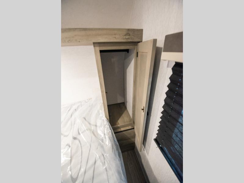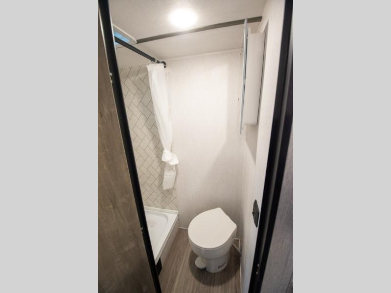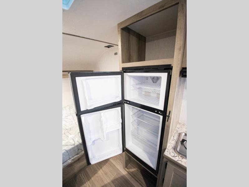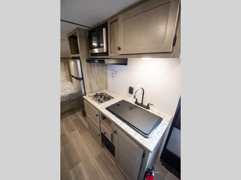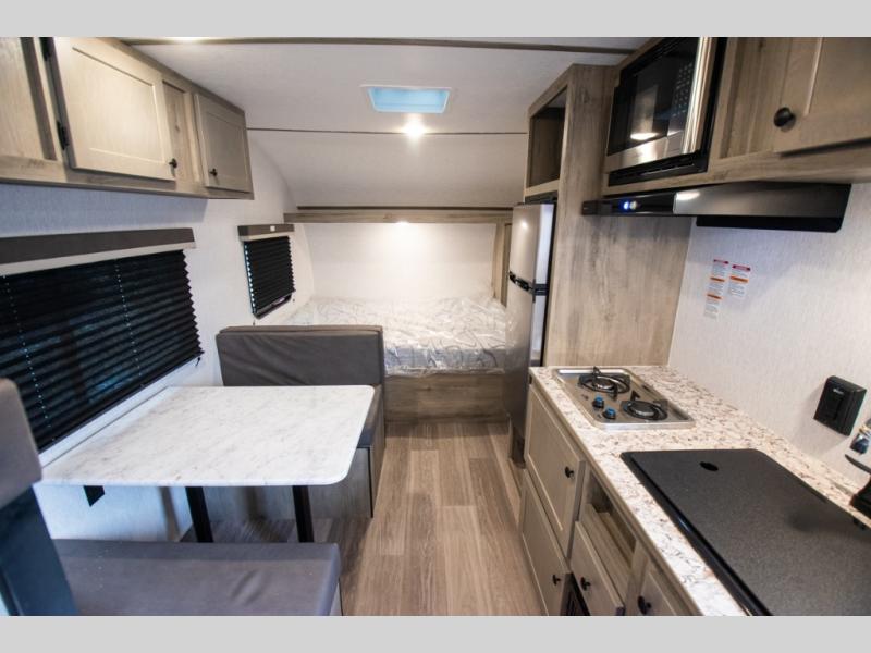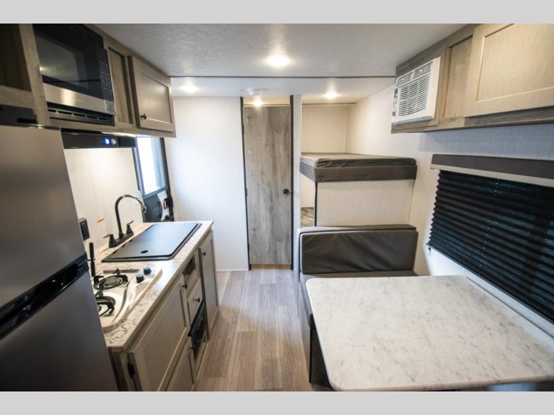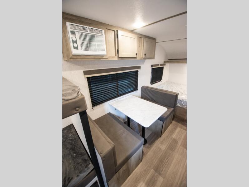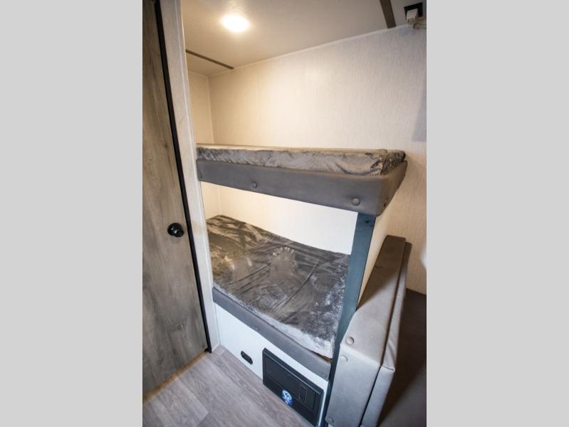 If you've been wanting to ditch that old tent and upgrade to a travel trailer, this easy-to-tow unit is the one! You will have a front RV queen bed to sleep on instead of an air mattress or cot, and there are even bunk beds in the back for the little ones. The bathroom includes a shower and a toilet so you don't have to use the camp's facilities in the middle of the night, and there is a closet plus a shelf by the front bed for storage space. You will love having a kitchen to cook meals in that include a two burner stove, a 4.3 cu. ft. 12V refrigerator, plus a double sink for easy clean up. When dinner is ready, you can dine at the 30" booth dinette and play a game of cards when everything is cleaned up!