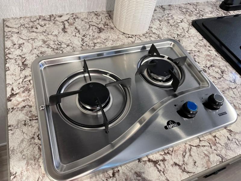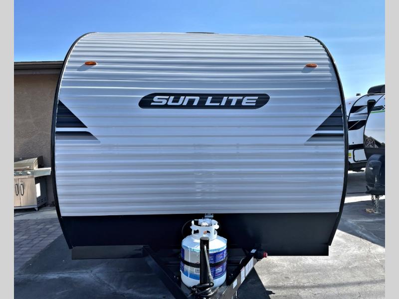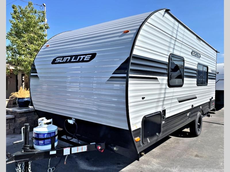 The perfect couple's trailer is waiting for you with this Sun Lite LTD! The front RV queen bed will provide a great night's rest after a day of hiking outdoors, and the full rear bath will let you clean up each day. There is a booth dinette where you can dine at each day, and even let another guest sleep over if needed. You'll also find a two burner stove to make meals, a double sink to clean up, and a 4.3 cu. ft. 12V refrigerator for leftovers! What's not to love about this travel trailer?!
