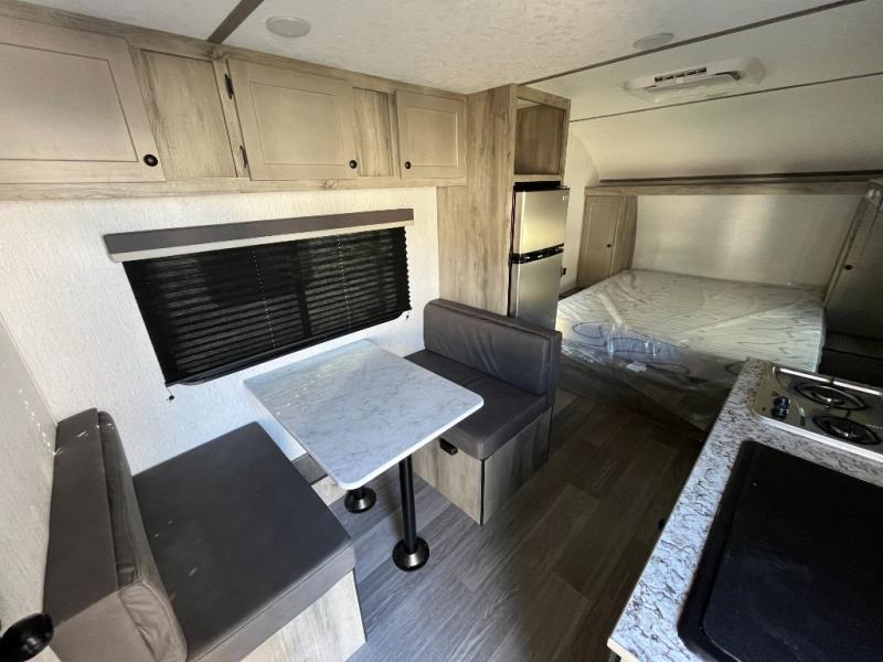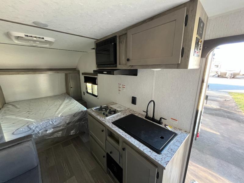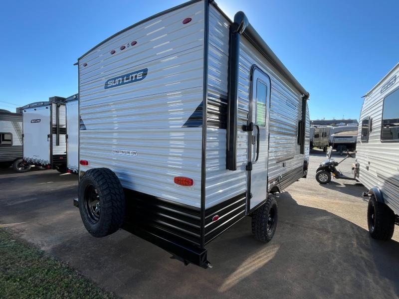 The perfect couple's trailer is waiting for you with this Sun Lite LTD! The front RV queen bed will provide a great night's rest after a day of hiking outdoors, and the full rear bath will let you clean up each day. There is a booth dinette where you can dine at each day, and even let another guest sleep over if needed. You'll also find a two burner stove to make meals, a double sink to clean up, and a 4.3 cu. ft. 12V refrigerator for leftovers! What's not to love about this travel trailer?!