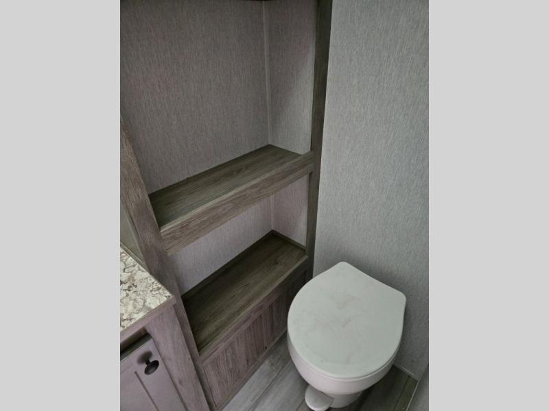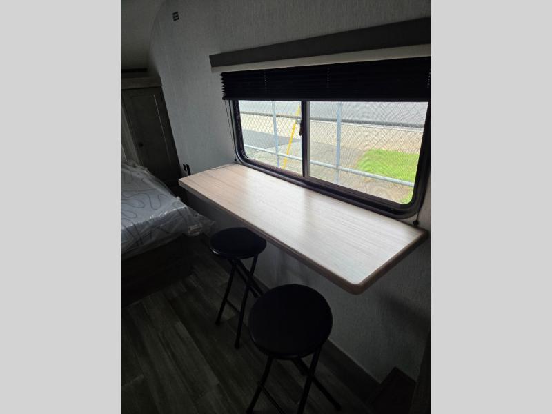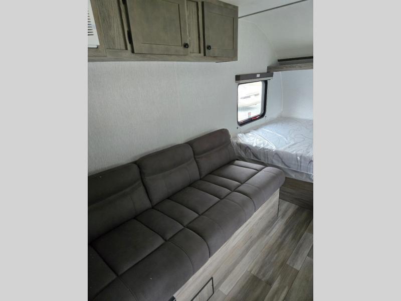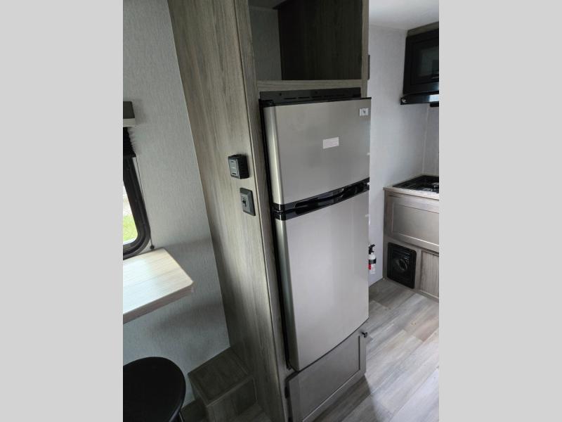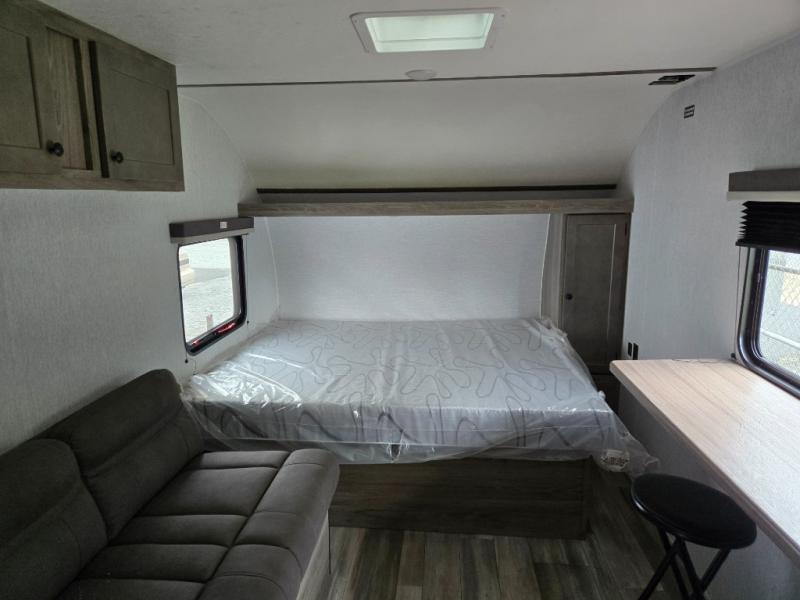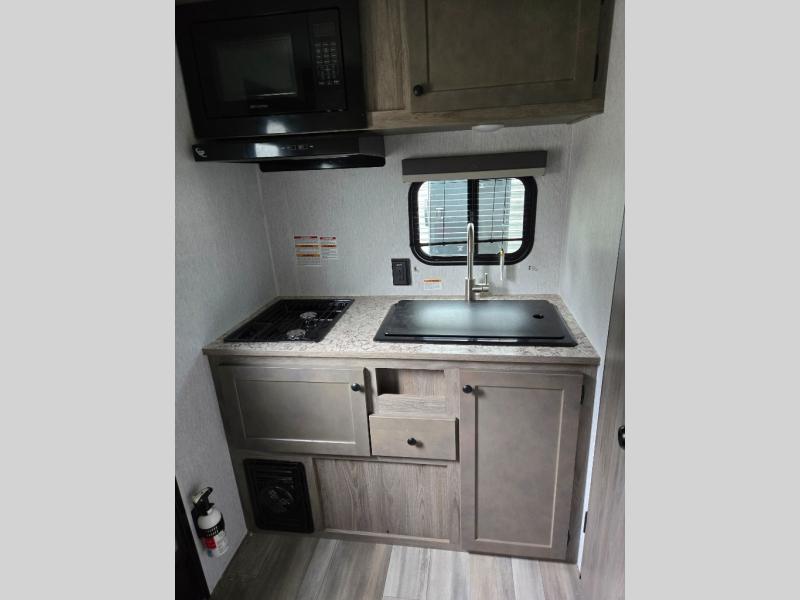 You're going to love every minute spent in this cozy travel trailer for three happy campers! The rear corner kitchen includes a two burner stove and double sink for easy clean up, and the full bath is in the other rear corner. This model also includes a 4.3 cu. ft. 12V refrigerator and a bar top where you can enjoy your meals together each day. The 68" jiffy sofa provides a place to relax in the evenings, and an overnight guests can make their bed here at night. You will find the RV queen bed to be accommodating, especially with its shelf for your personal belongings and a closet for clothes!