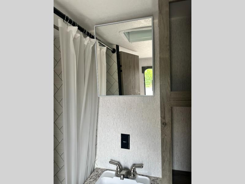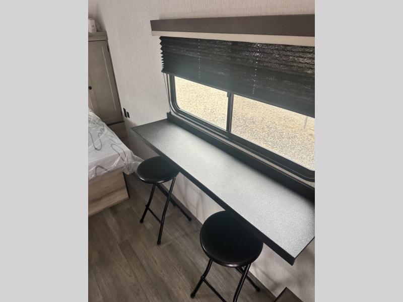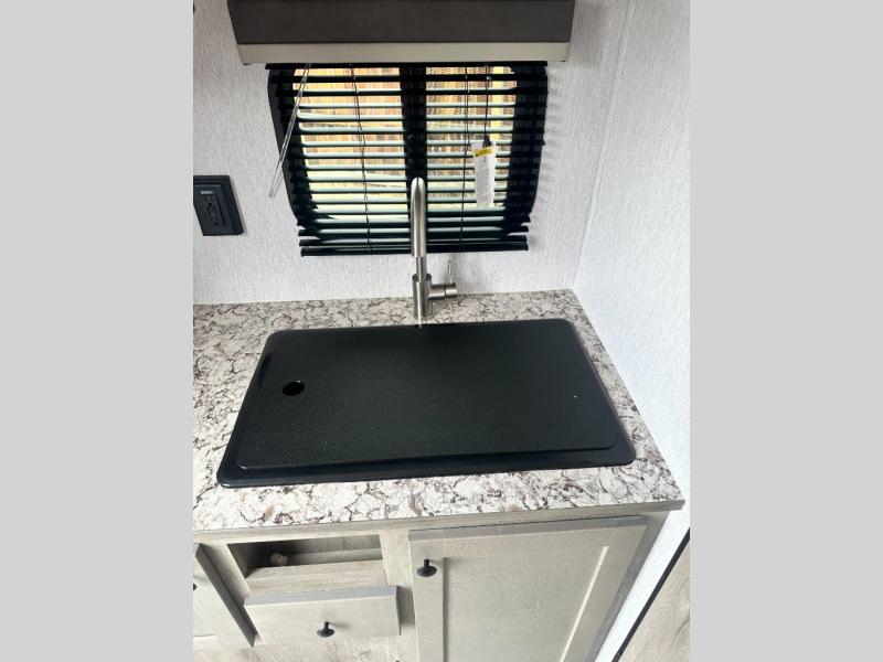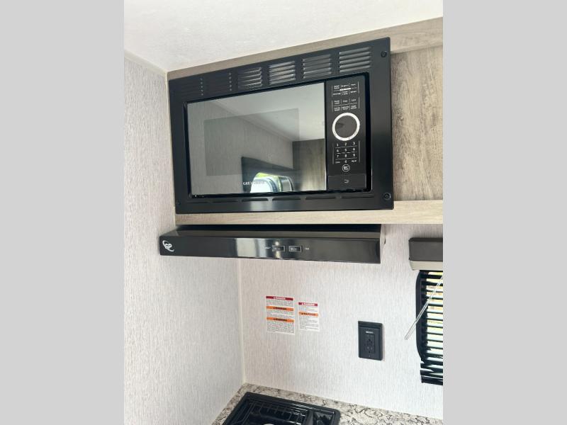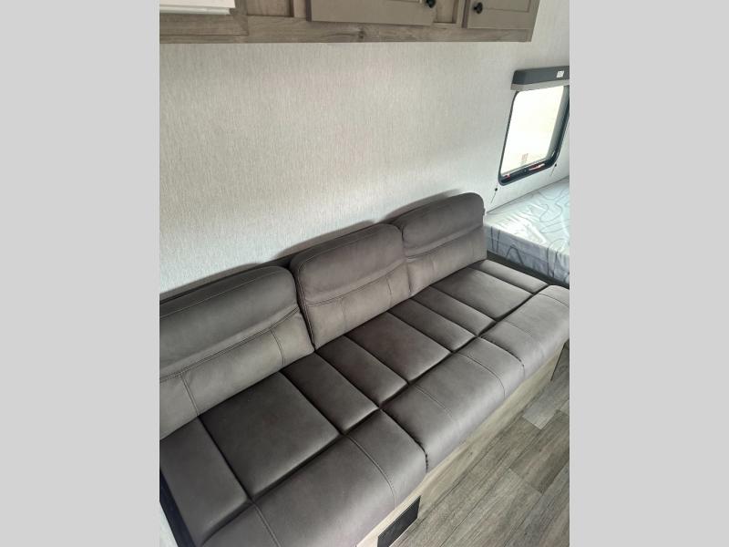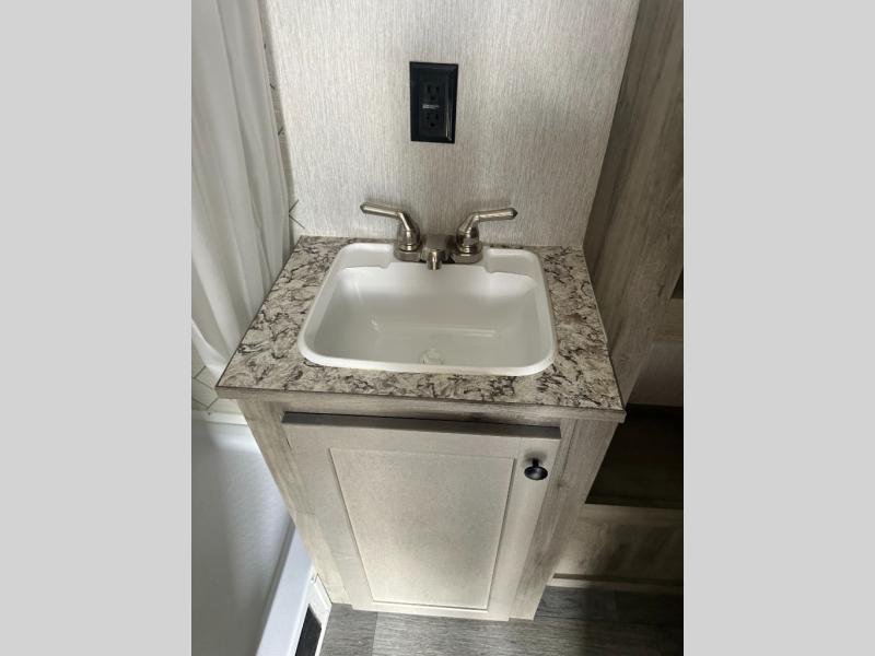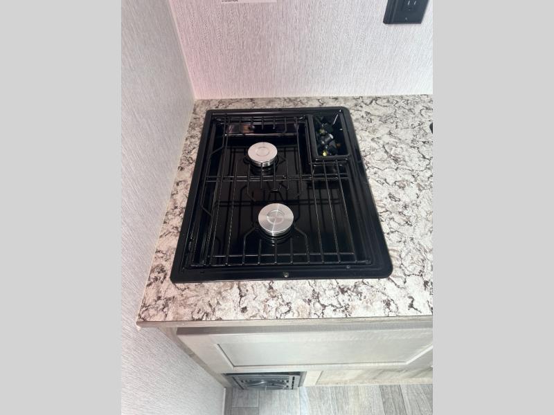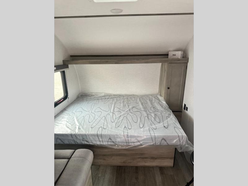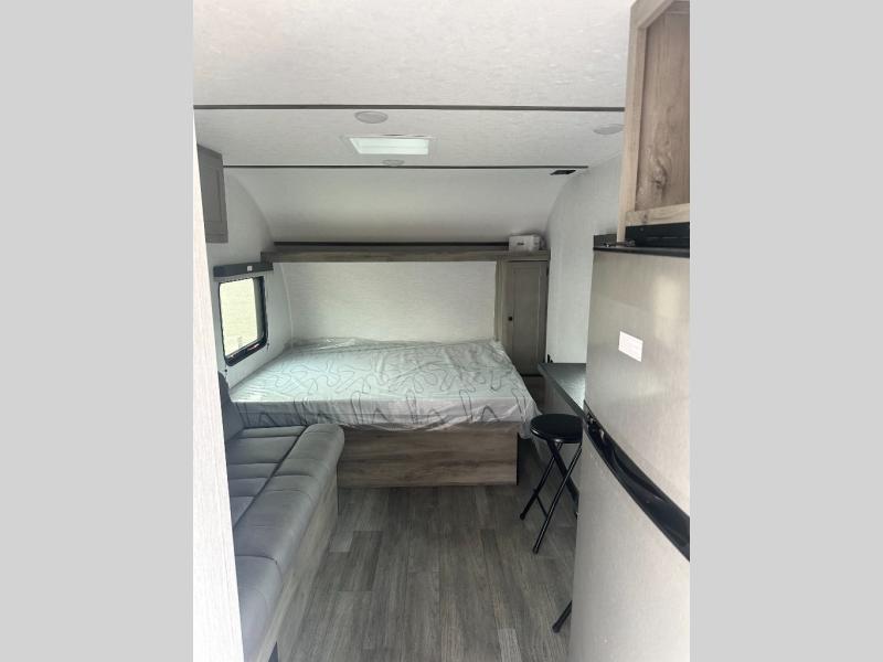 You're going to love every minute spent in this cozy travel trailer for three happy campers! The rear corner kitchen includes a two burner stove and double sink for easy clean up, and the full bath is in the other rear corner. This model also includes a 4.3 cu. ft. 12V refrigerator and a bar top where you can enjoy your meals together each day. The 68" jiffy sofa provides a place to relax in the evenings, and an overnight guests can make their bed here at night. You will find the RV queen bed to be accommodating, especially with its shelf for your personal belongings and a closet for clothes!