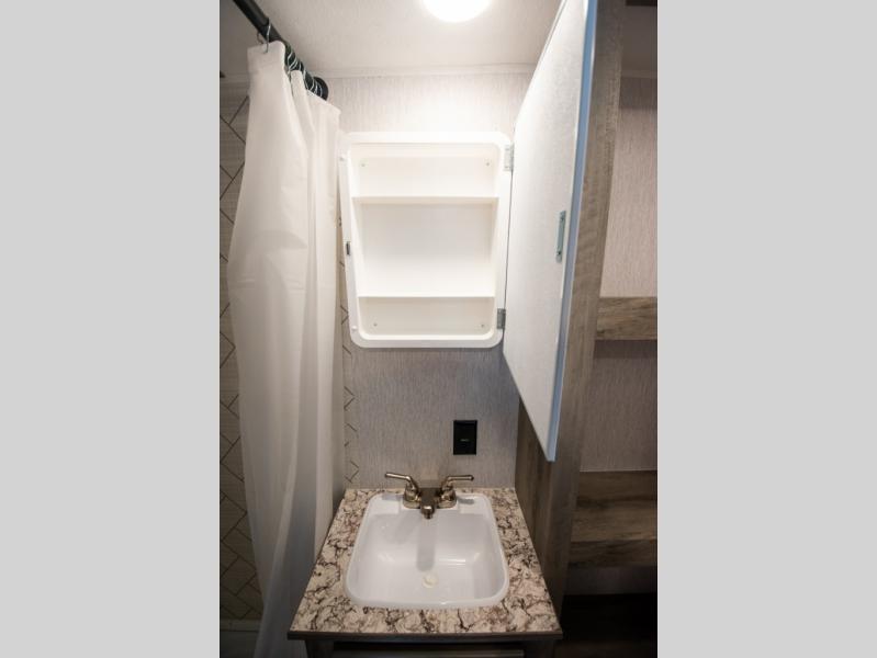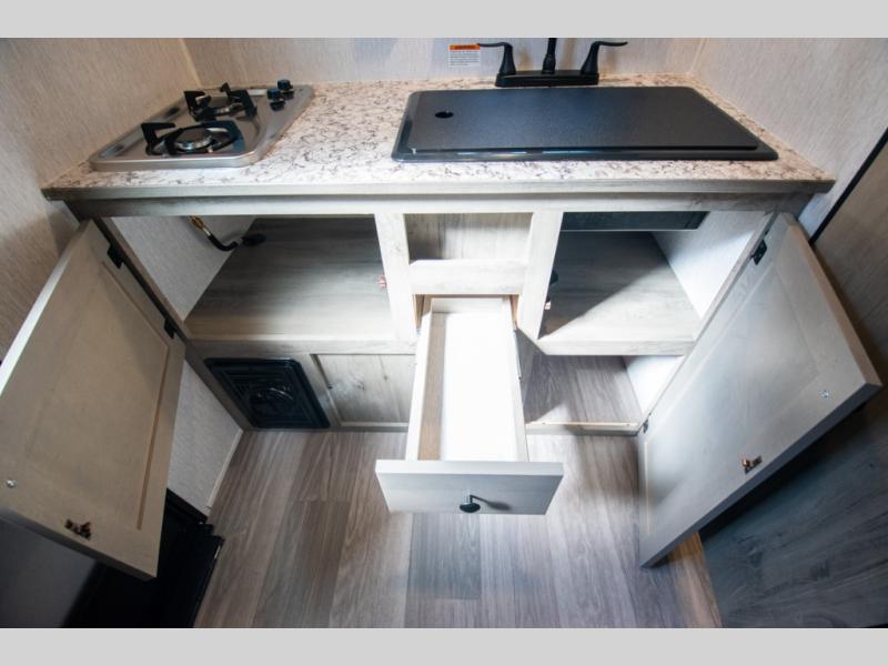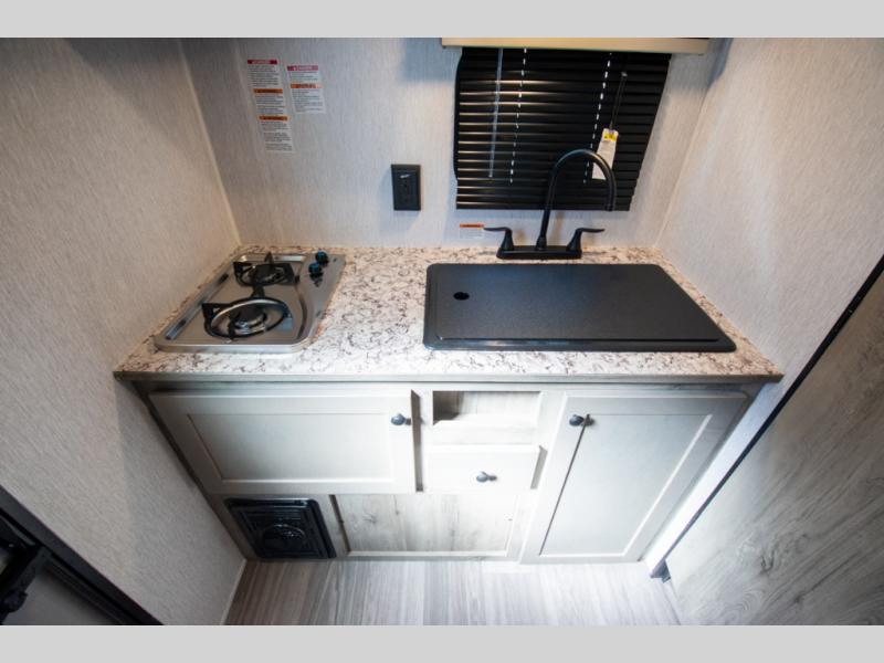 You're going to love every minute spent in this cozy travel trailer for three happy campers! The rear corner kitchen includes a two burner stove and double sink for easy clean up, and the full bath is in the other rear corner. This model also includes a 4.3 cu. ft. 12V refrigerator and a bar top where you can enjoy your meals together each day. The 68" jiffy sofa provides a place to relax in the evenings, and an overnight guests can make their bed here at night. You will find the RV queen bed to be accommodating, especially with its shelf for your personal belongings and a closet for clothes!