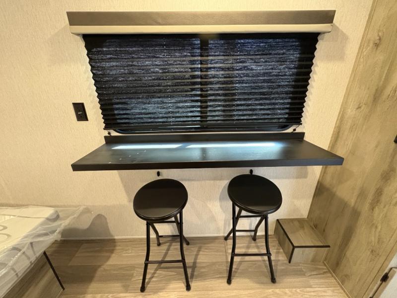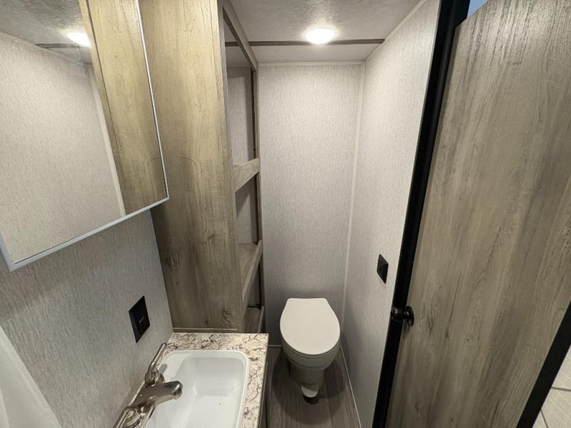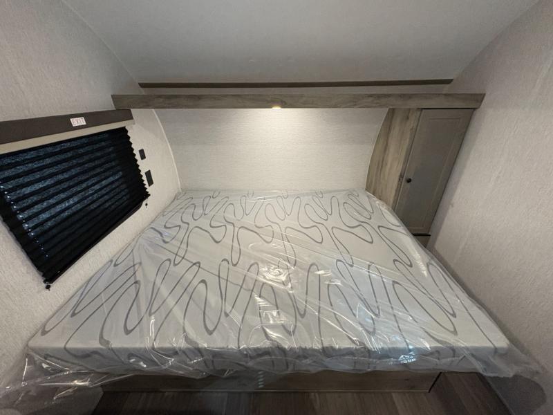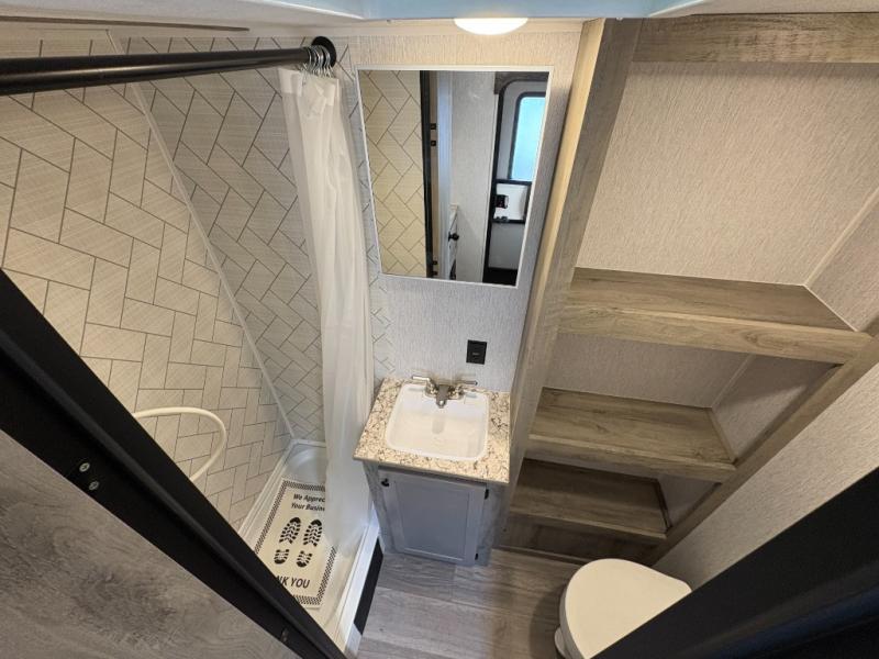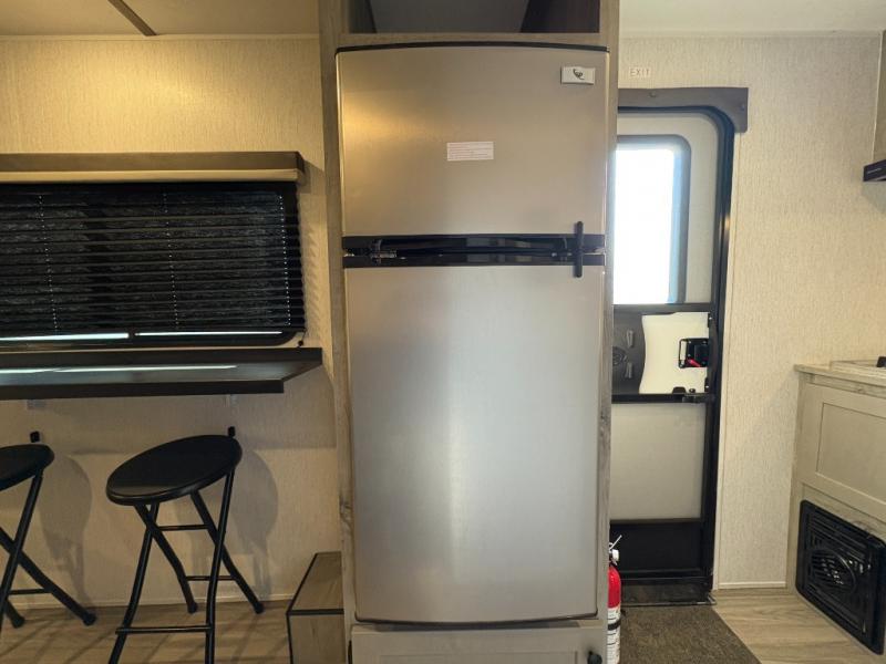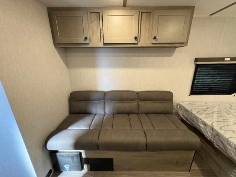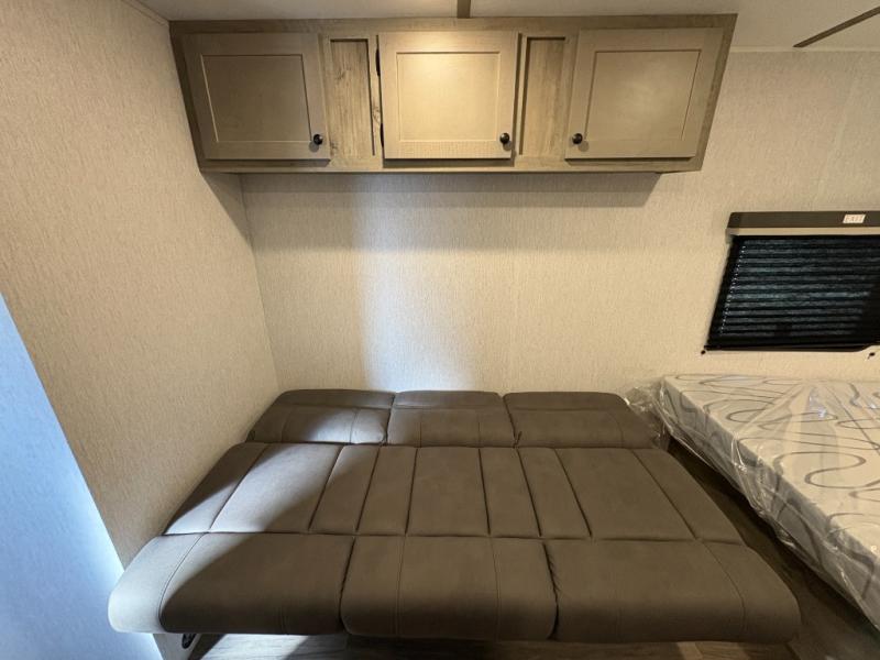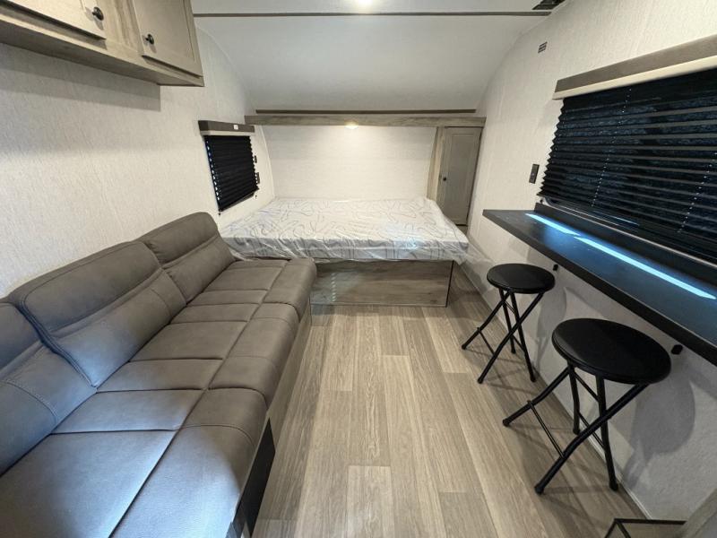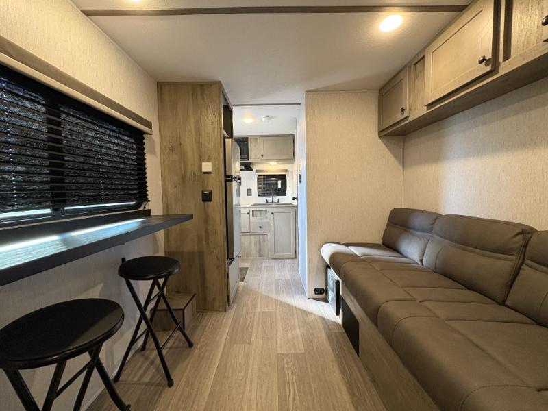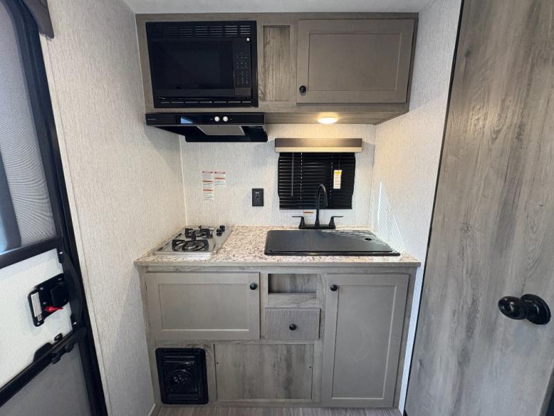 You're going to love every minute spent in this cozy travel trailer for three happy campers! The rear corner kitchen includes a two burner stove and double sink for easy clean up, and the full bath is in the other rear corner. This model also includes a 4.3 cu. ft. 12V refrigerator and a bar top where you can enjoy your meals together each day. The 68" jiffy sofa provides a place to relax in the evenings, and an overnight guests can make their bed here at night. You will find the RV queen bed to be accommodating, especially with its shelf for your personal belongings and a closet for clothes!