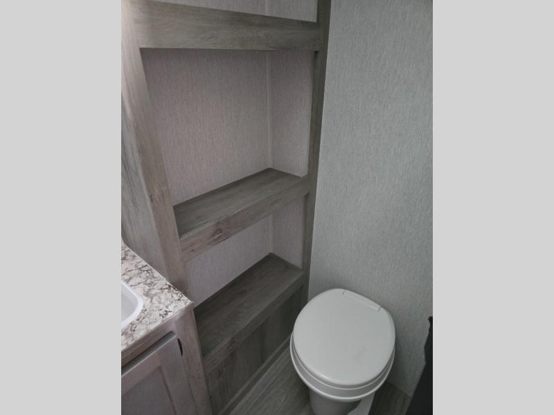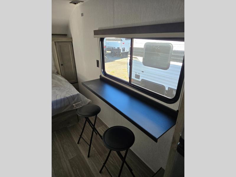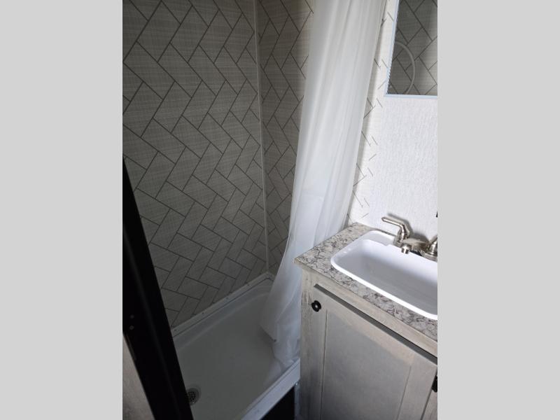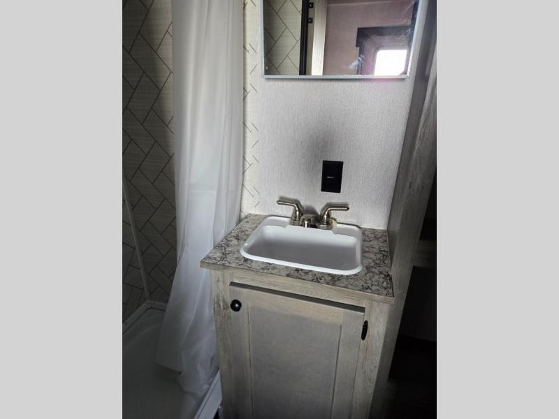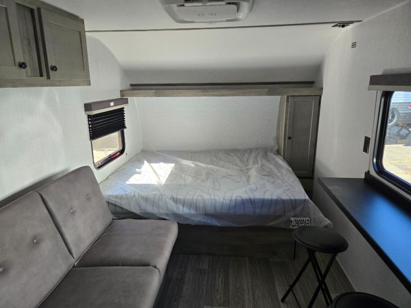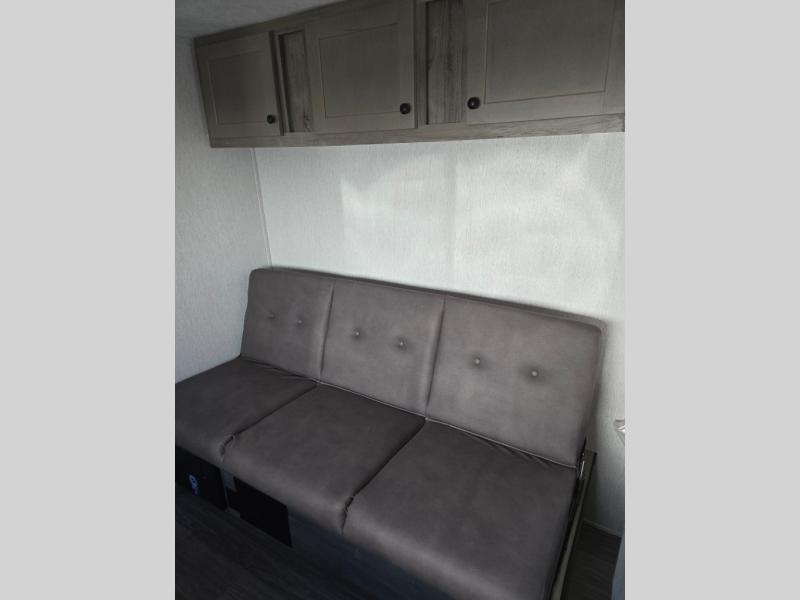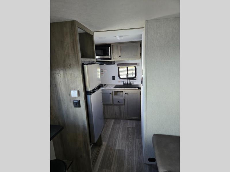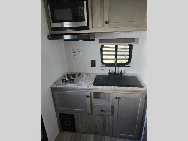 You're going to love every minute spent in this cozy travel trailer for three happy campers! The rear corner kitchen includes a two burner stove and double sink for easy clean up, and the full bath is in the other rear corner. This model also includes a 4.3 cu. ft. 12V refrigerator and a bar top where you can enjoy your meals together each day. The 68" jiffy sofa provides a place to relax in the evenings, and an overnight guests can make their bed here at night. You will find the RV queen bed to be accommodating, especially with its shelf for your personal belongings and a closet for clothes!