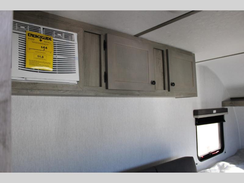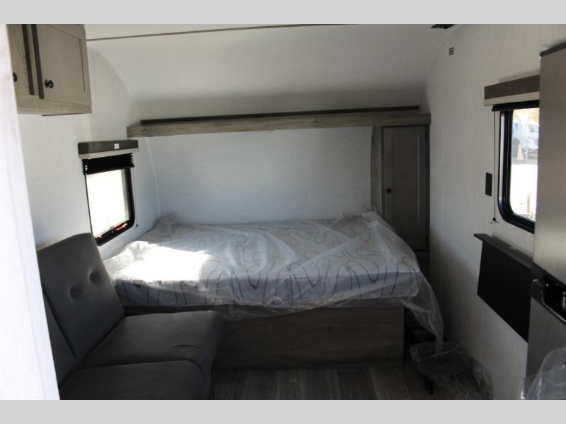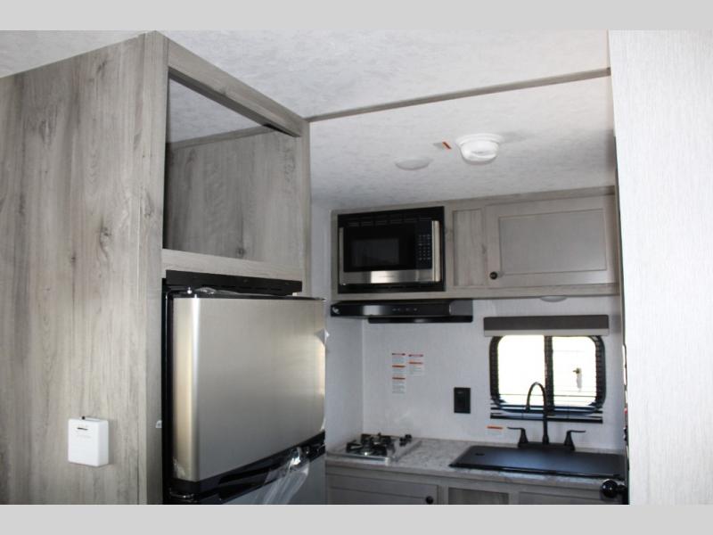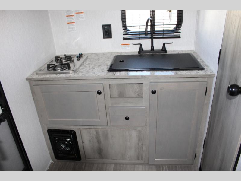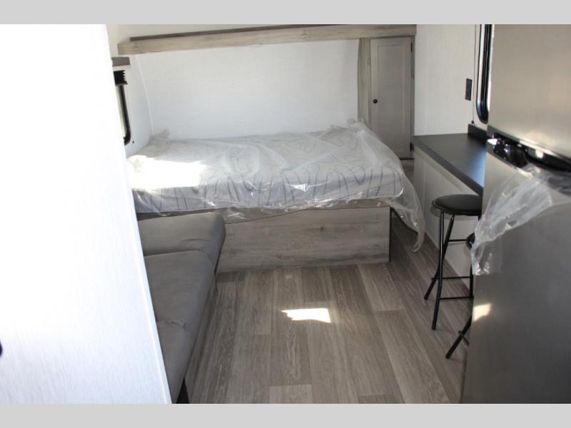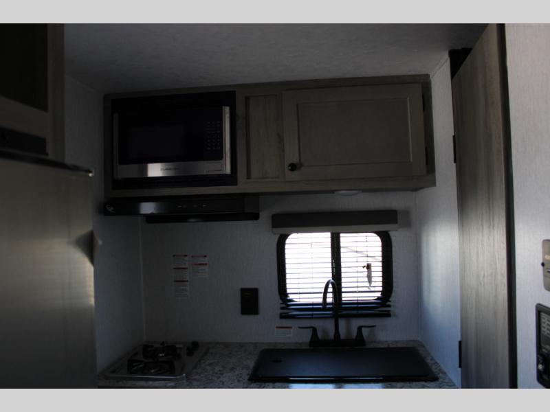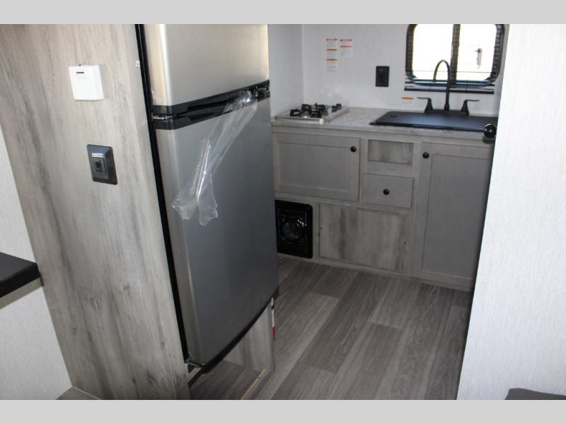 You're going to love every minute spent in this cozy travel trailer for three happy campers! The rear corner kitchen includes a two burner stove and double sink for easy clean up, and the full bath is in the other rear corner. This model also includes a 4.3 cu. ft. 12V refrigerator and a bar top where you can enjoy your meals together each day. The 68" jiffy sofa provides a place to relax in the evenings, and an overnight guests can make their bed here at night. You will find the RV queen bed to be accommodating, especially with its shelf for your personal belongings and a closet for clothes!