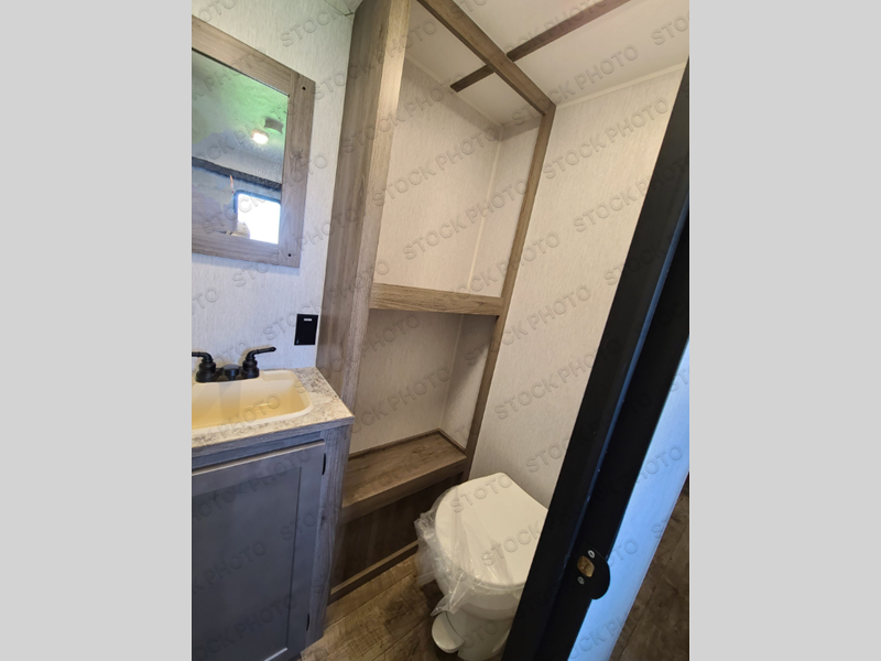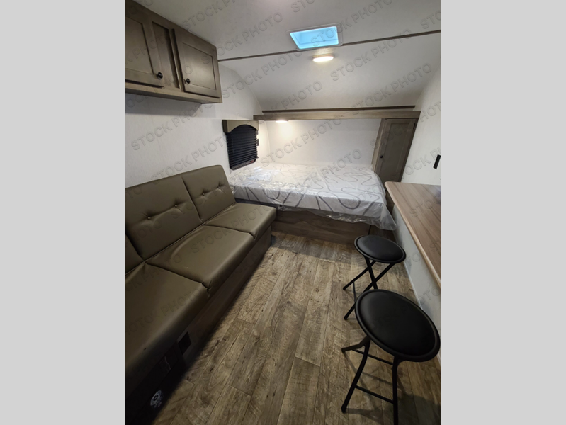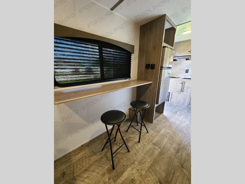 You're going to love every minute spent in this cozy travel trailer for three happy campers! The rear corner kitchen includes a two burner stove and double sink for easy clean up, and the full bath is in the other rear corner. This model also includes a 4.3 cu. ft. 12V refrigerator and a bar top where you can enjoy your meals together each day. The 68" jiffy sofa provides a place to relax in the evenings, and an overnight guests can make their bed here at night. You will find the RV queen bed to be accommodating, especially with its shelf for your personal belongings and a closet for clothes!