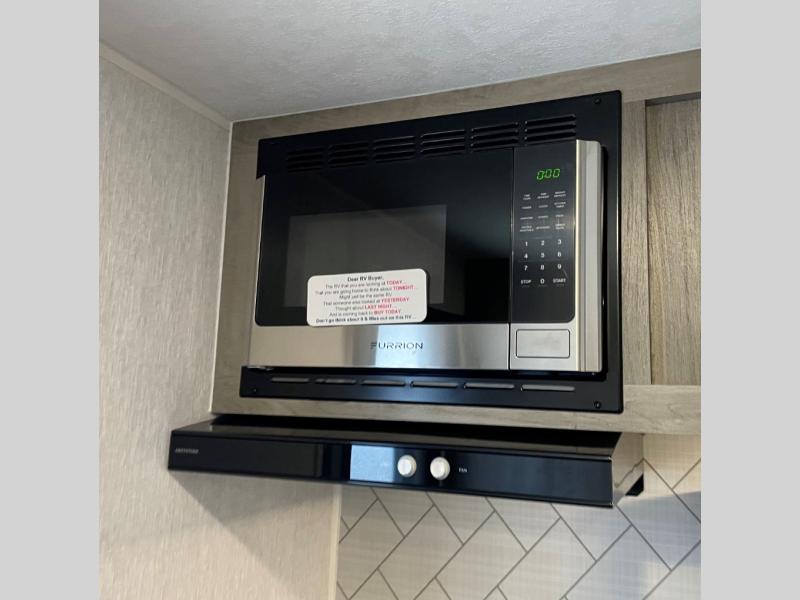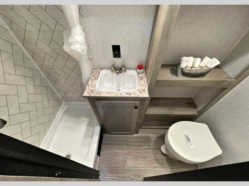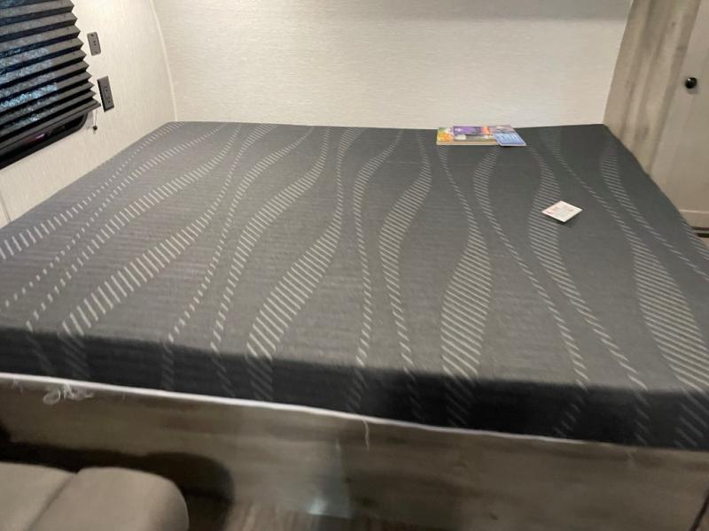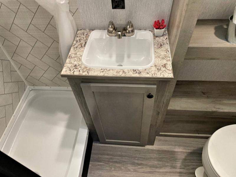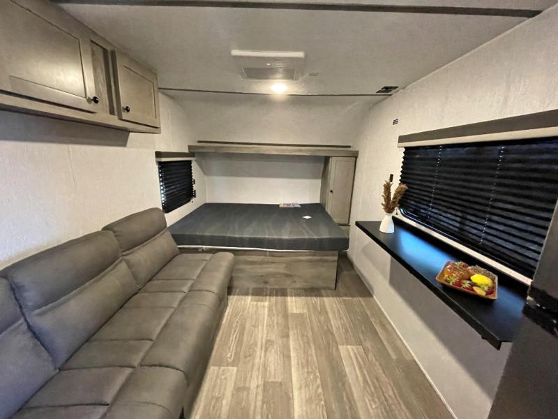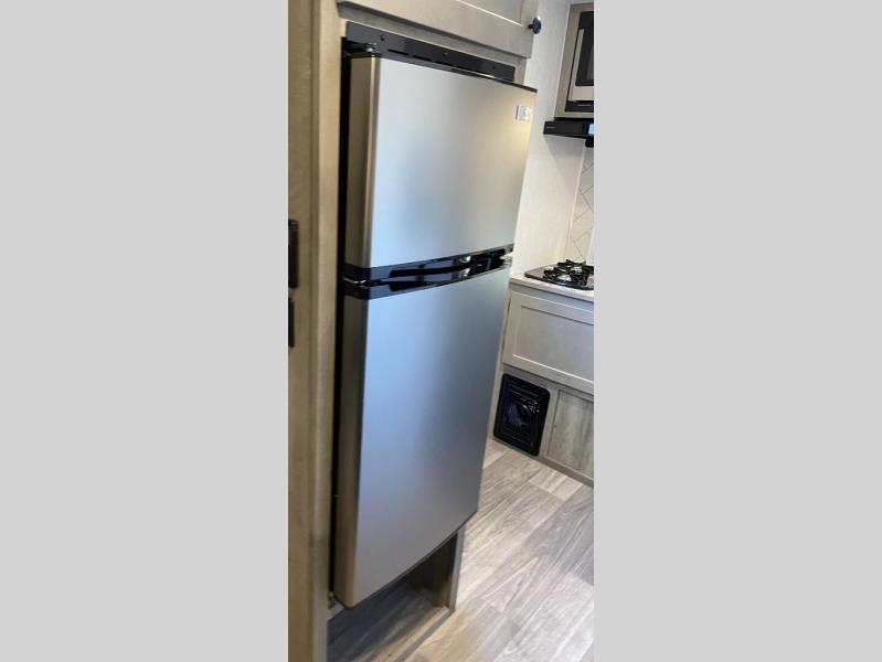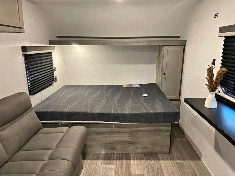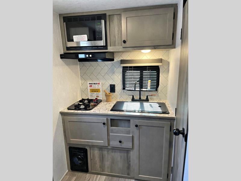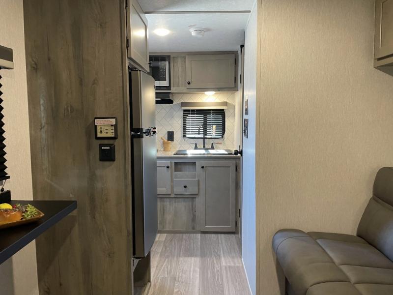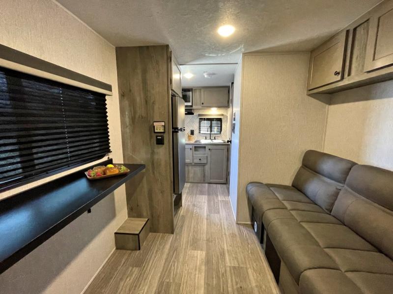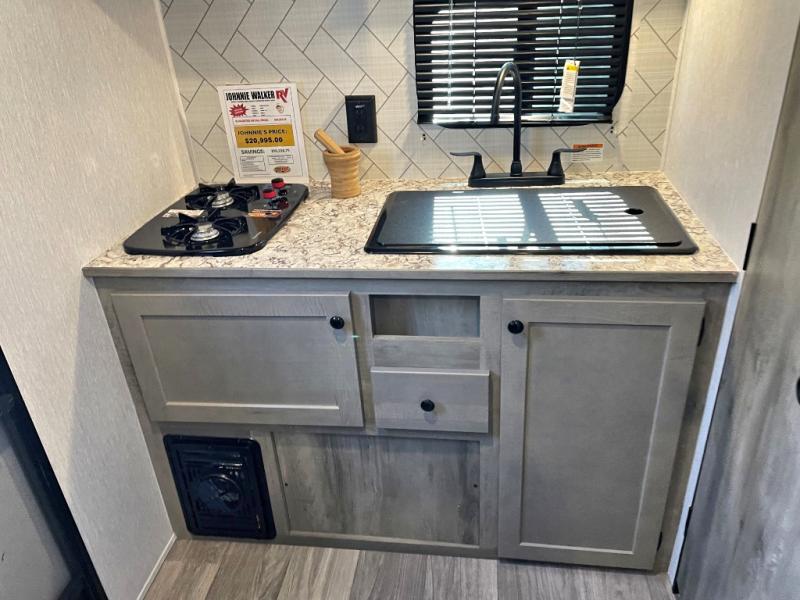 You're going to love every minute spent in this cozy travel trailer for three happy campers! The rear corner kitchen includes a two burner stove and double sink for easy clean up, and the full bath is in the other rear corner. This model also includes a 4.3 cu. ft. 12V refrigerator and a bar top where you can enjoy your meals together each day. The 68" jiffy sofa provides a place to relax in the evenings, and an overnight guests can make their bed here at night. You will find the RV queen bed to be accommodating, especially with its shelf for your personal belongings and a closet for clothes!