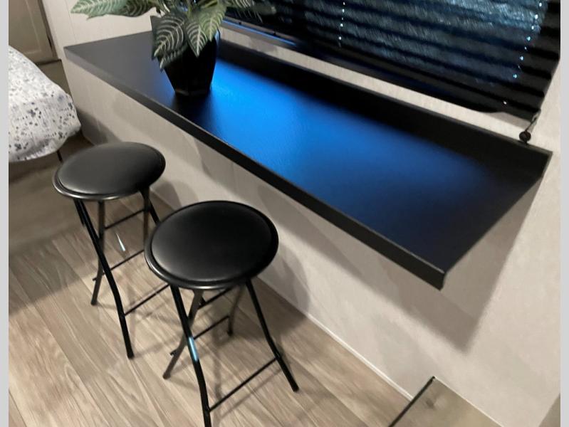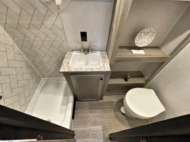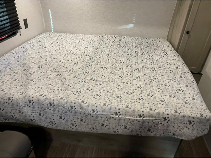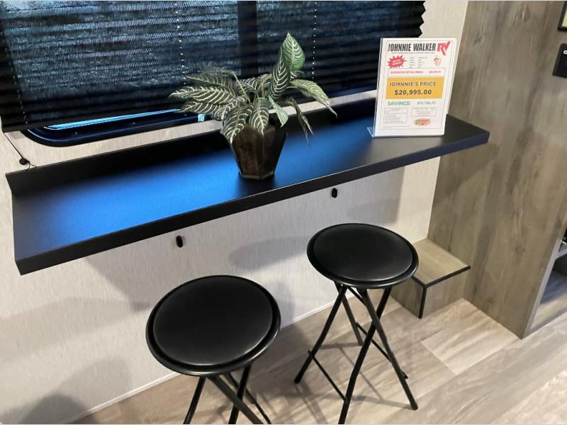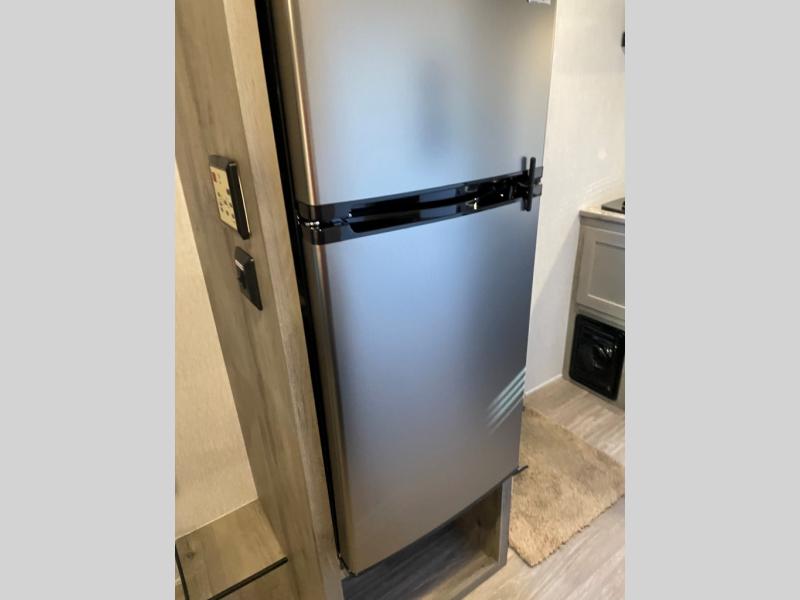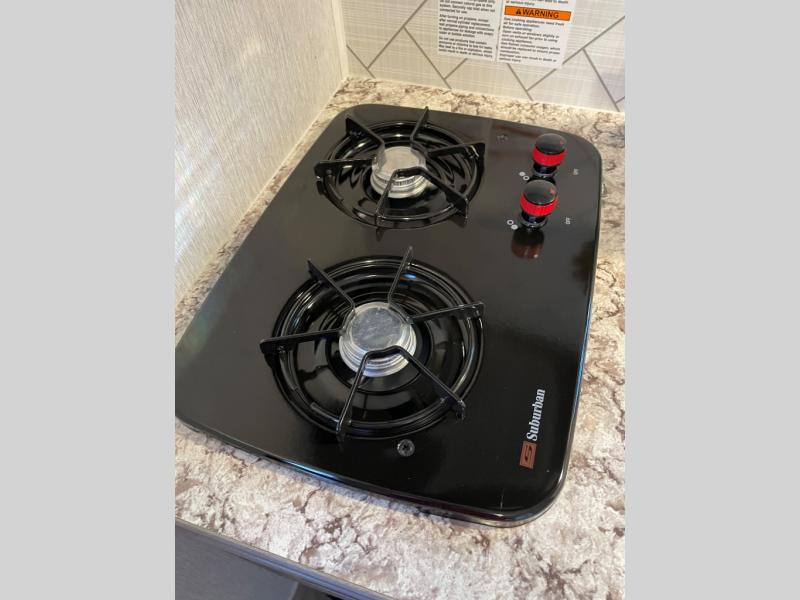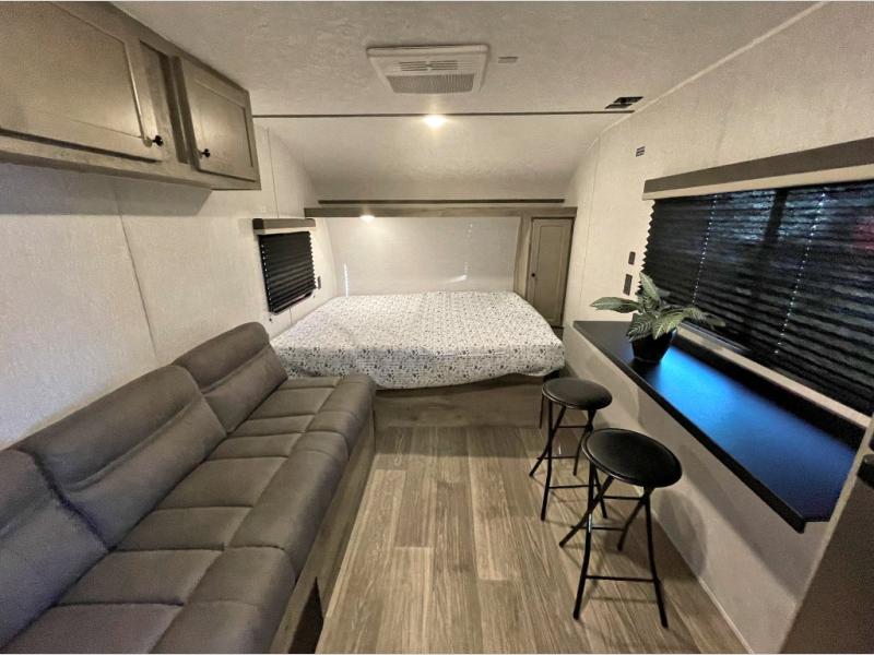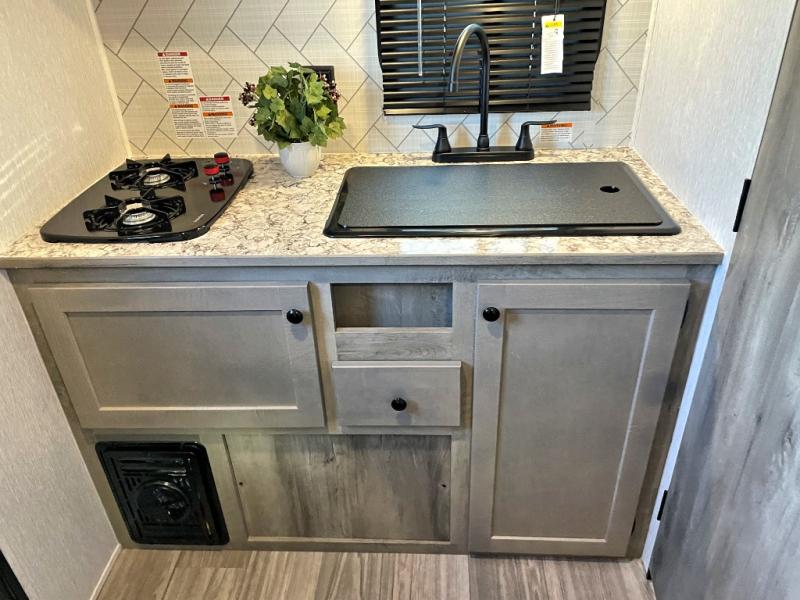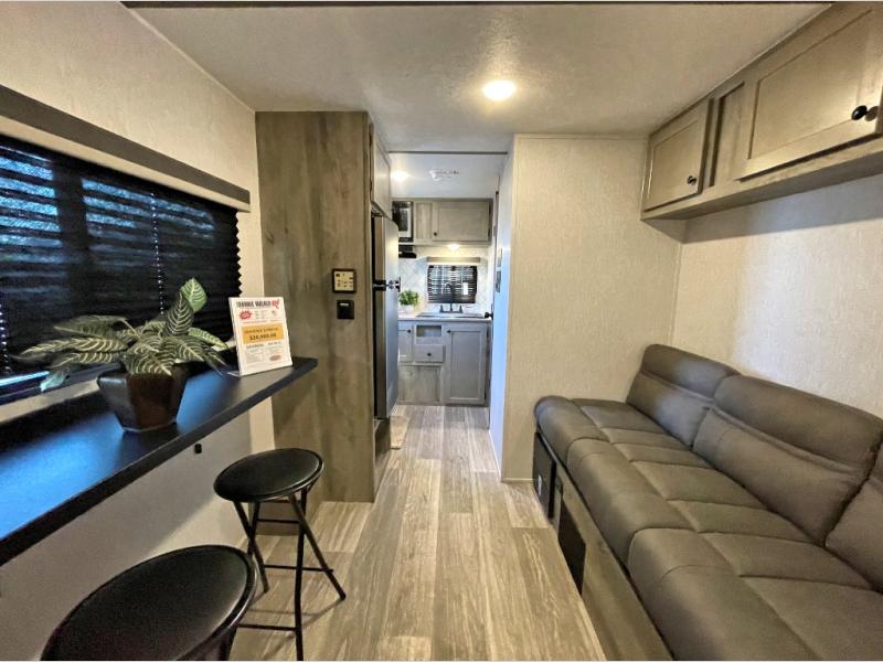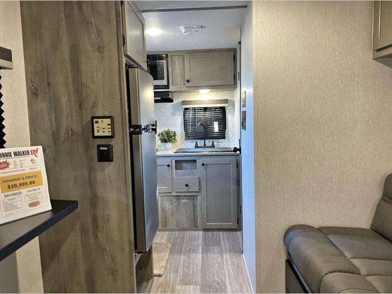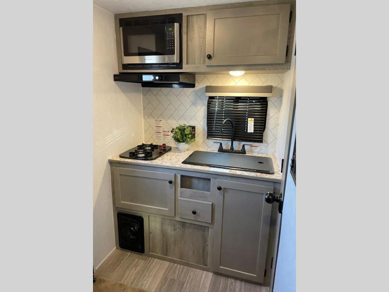 You're going to love every minute spent in this cozy travel trailer for three happy campers! The rear corner kitchen includes a two burner stove and double sink for easy clean up, and the full bath is in the other rear corner. This model also includes a 4.3 cu. ft. 12V refrigerator and a bar top where you can enjoy your meals together each day. The 68" jiffy sofa provides a place to relax in the evenings, and an overnight guests can make their bed here at night. You will find the RV queen bed to be accommodating, especially with its shelf for your personal belongings and a closet for clothes!
