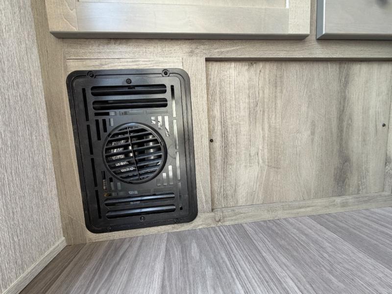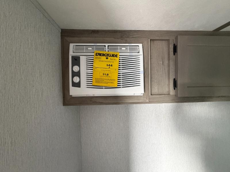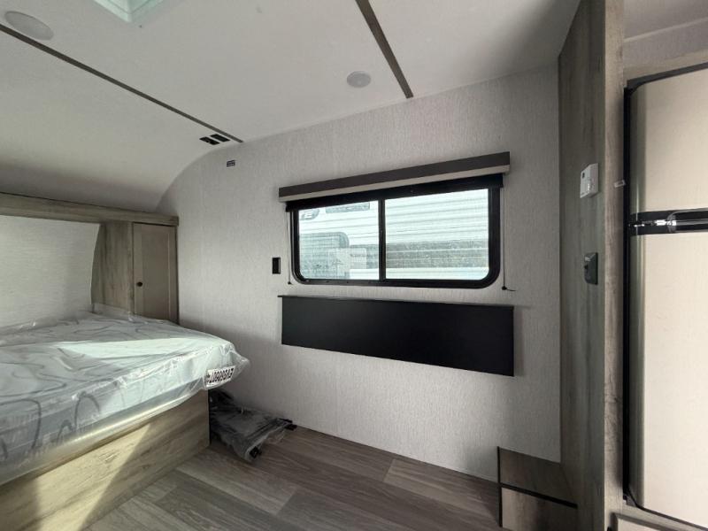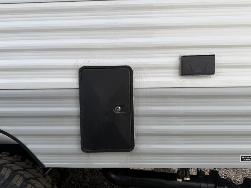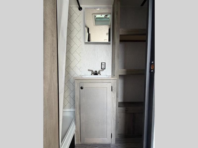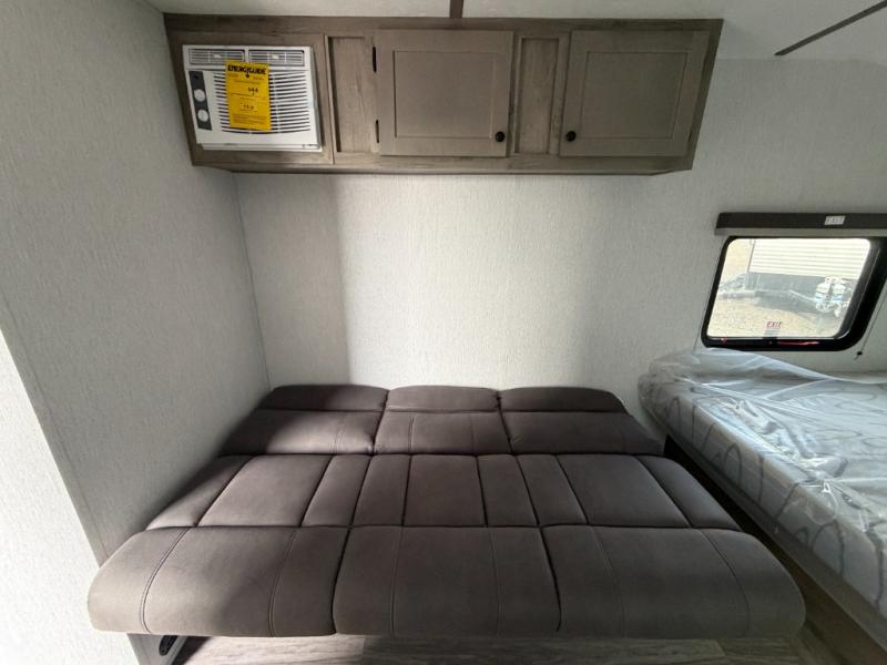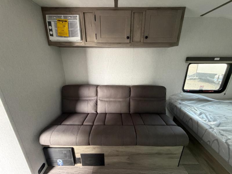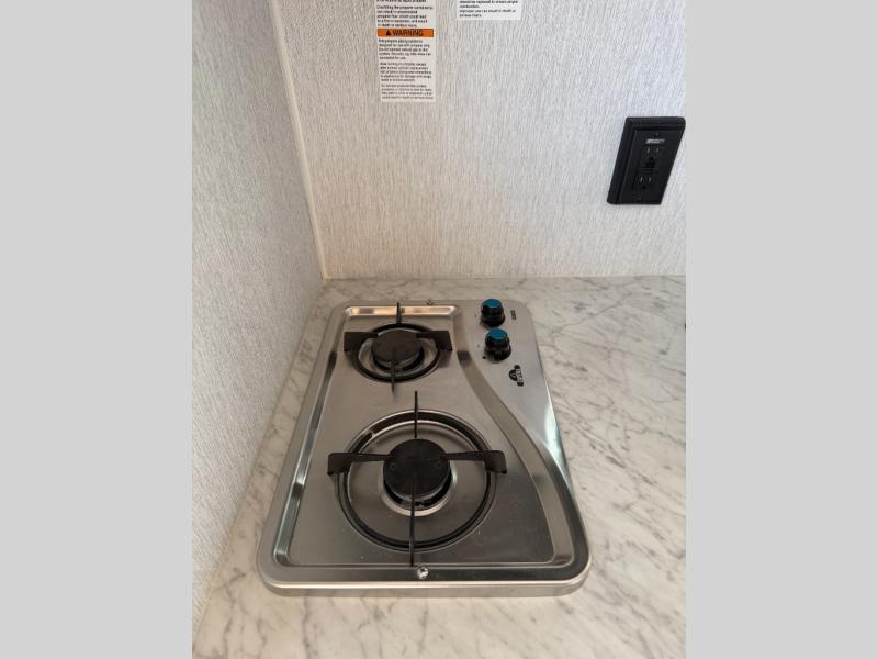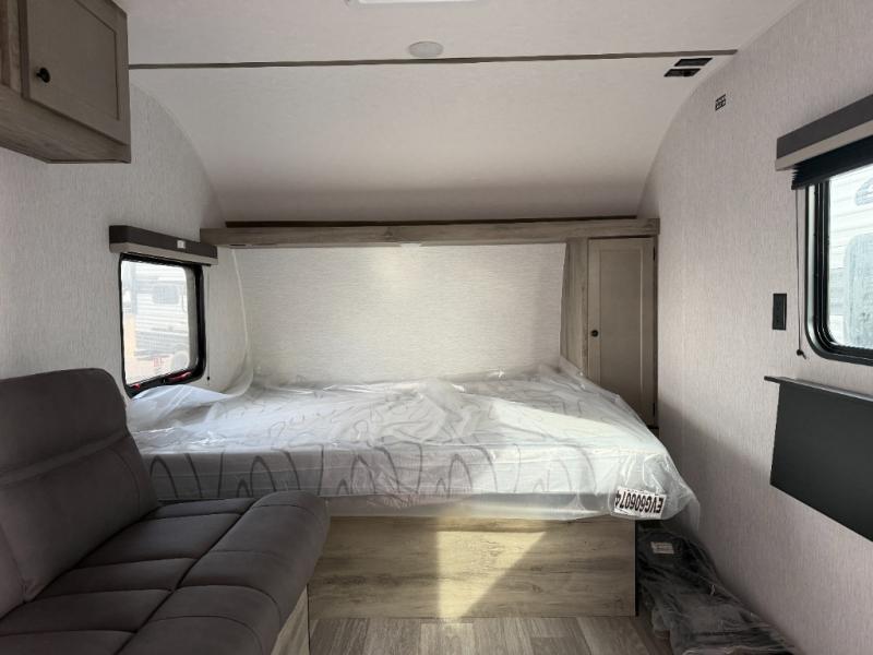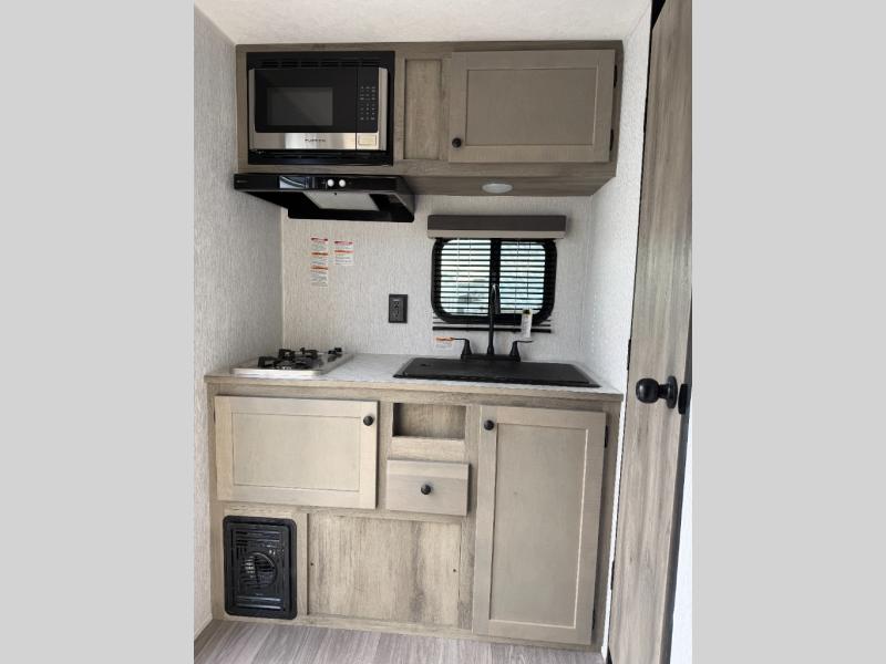 You're going to love every minute spent in this cozy travel trailer for three happy campers! The rear corner kitchen includes a two burner stove and double sink for easy clean up, and the full bath is in the other rear corner. This model also includes a 4.3 cu. ft. 12V refrigerator and a bar top where you can enjoy your meals together each day. The 68" jiffy sofa provides a place to relax in the evenings, and an overnight guests can make their bed here at night. You will find the RV queen bed to be accommodating, especially with its shelf for your personal belongings and a closet for clothes!