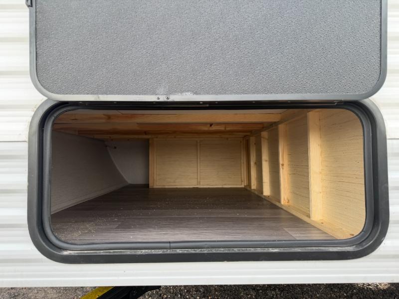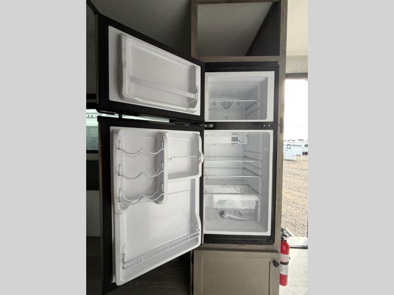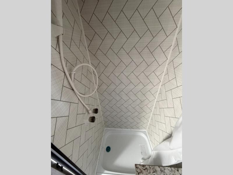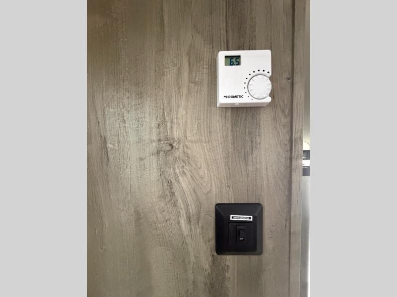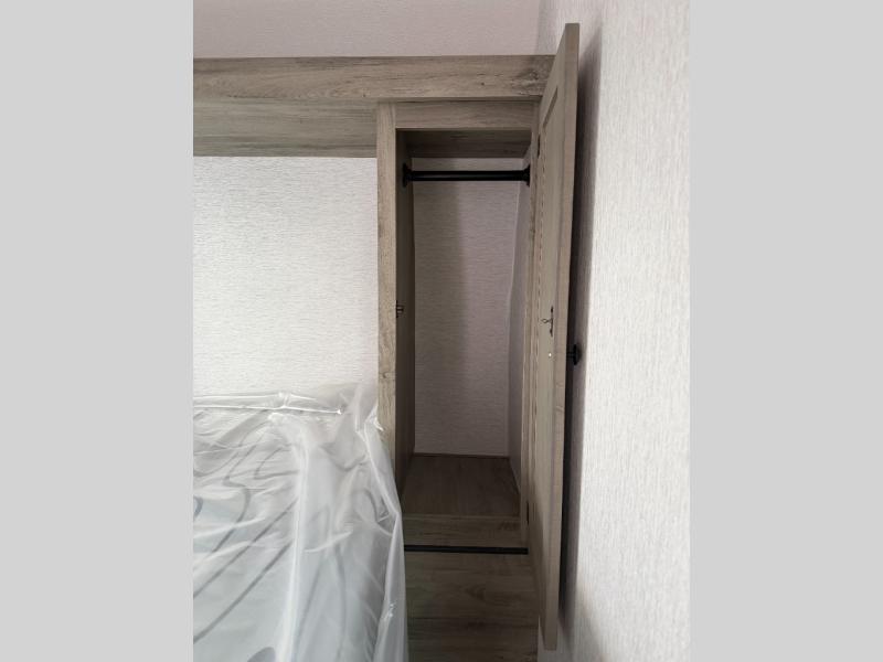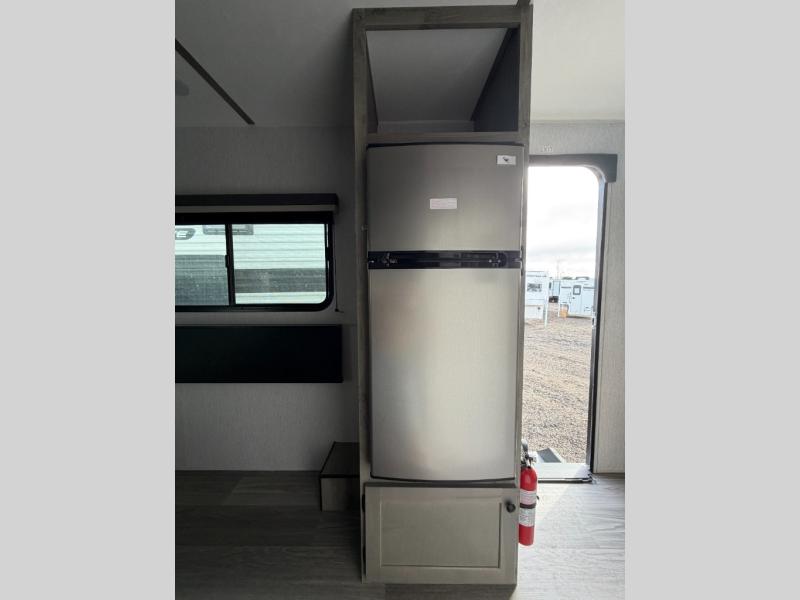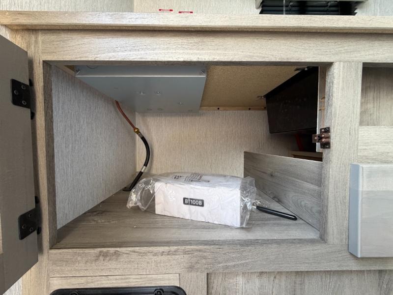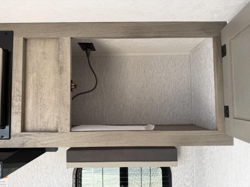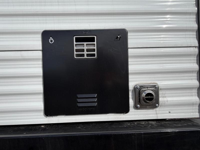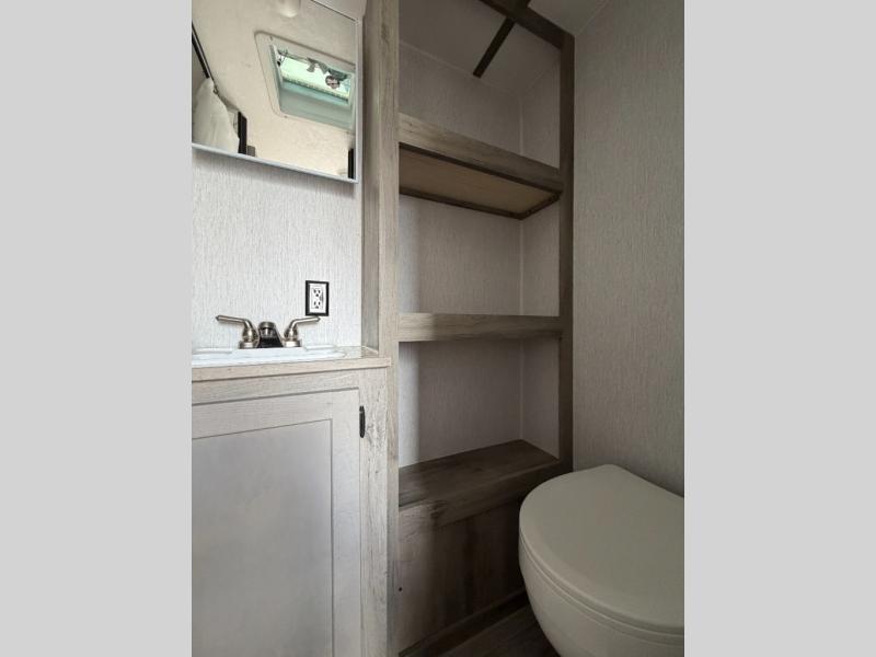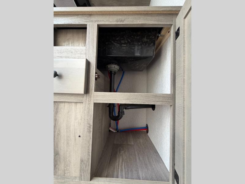 You're going to love every minute spent in this cozy travel trailer for three happy campers! The rear corner kitchen includes a two burner stove and double sink for easy clean up, and the full bath is in the other rear corner. This model also includes a 4.3 cu. ft. 12V refrigerator and a bar top where you can enjoy your meals together each day. The 68" jiffy sofa provides a place to relax in the evenings, and an overnight guests can make their bed here at night. You will find the RV queen bed to be accommodating, especially with its shelf for your personal belongings and a closet for clothes!