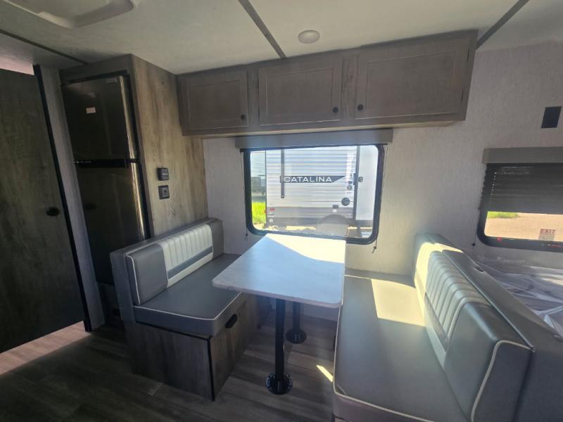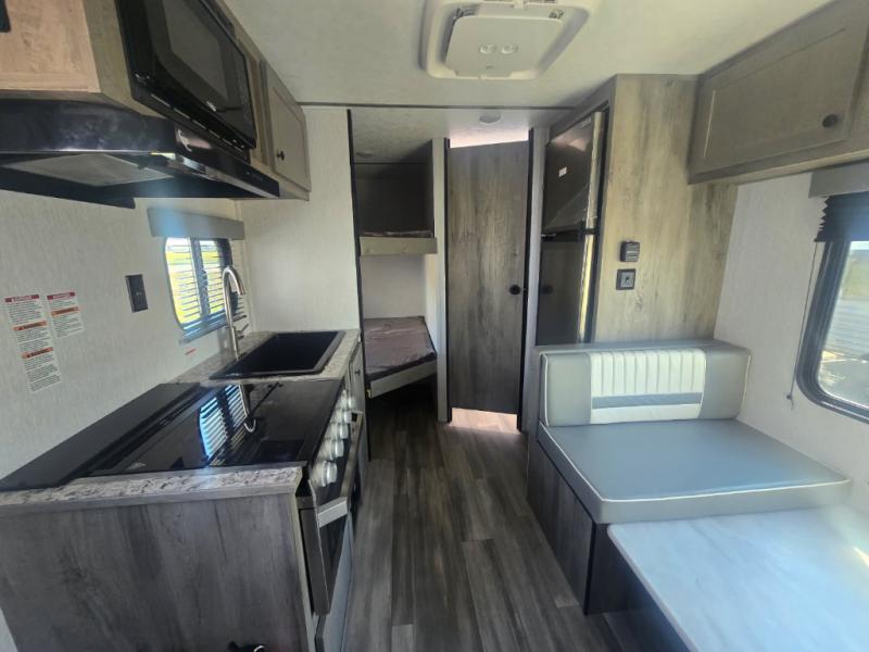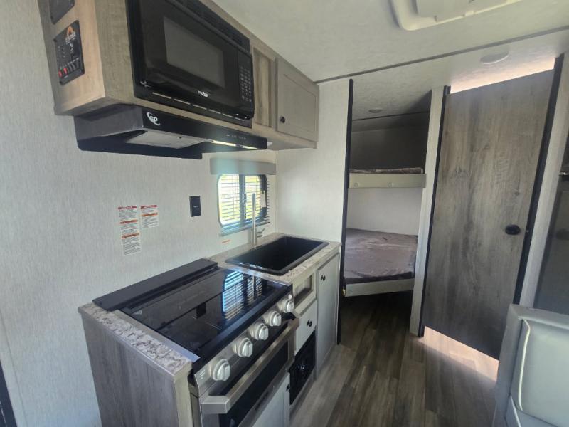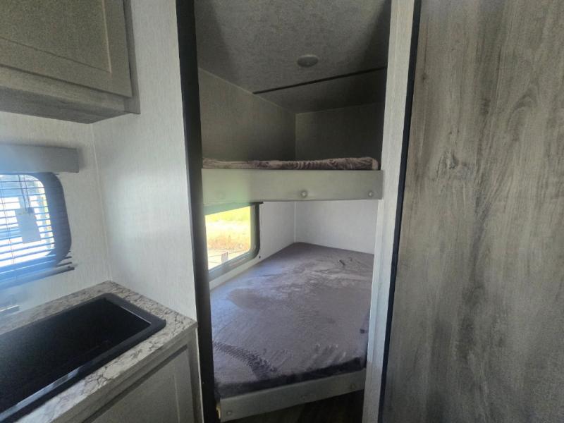 The perfect family-friendly travel trailer is found with this Sun Lite LTD model. You can take the front bed each night, while your guests or little ones take the double-size bunks towards the back. And if you're not needing the additional sleeping space, you can choose the desk option in place of the bunks. There is also a full bath right next to the bunks for easy nighttime use. The chef of your group can make meals using the three burner cooktop, and there is a double bowl sink for easy clean up. Once dinner has been cleaned up, you can play a game at the booth dinette, or head outdoors for an evening walk around the campground!