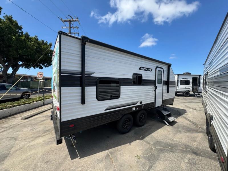 Each Sun Lite LTD travel trailer by Sunset Park RV is made with flexibility in mind. These lightweight models weigh under 3,000 lbs. for easy towing, and they offer best-in class interior storage for all your belongings. They are built with a one-piece PVC roof membrane and a durable rock guard that will help protect against rock and debris on the way to the campground. There is also an electric awning outside, along with a 100-watt solar kit, an outside shower, and more convenient features. You'll find a power roof vent in the bath, stylish window treatments, ball bearing drawer guides, and LED lights to name a few interior comforts.