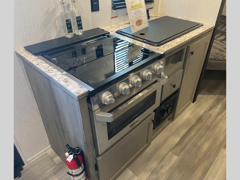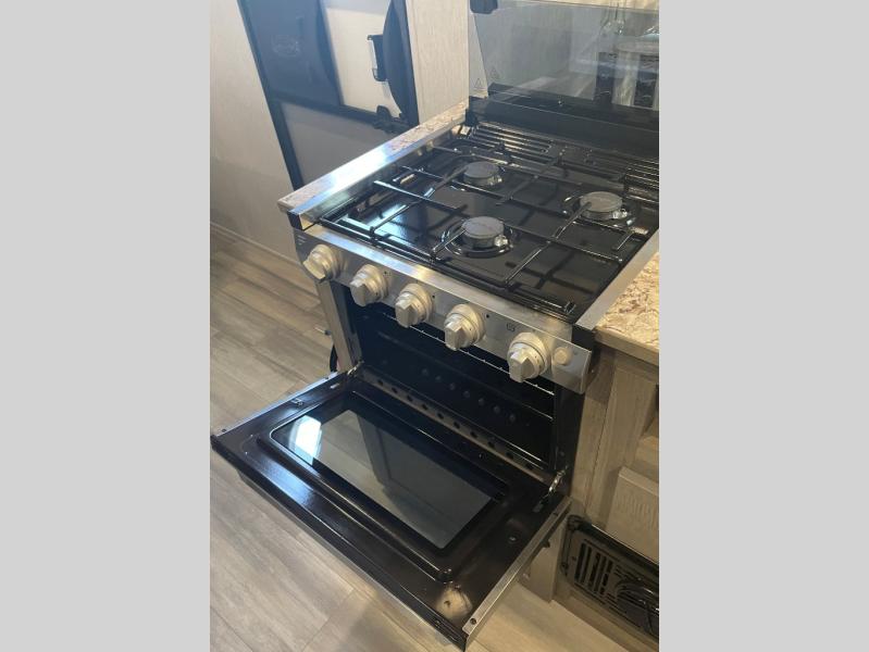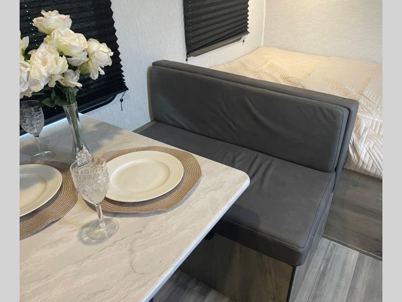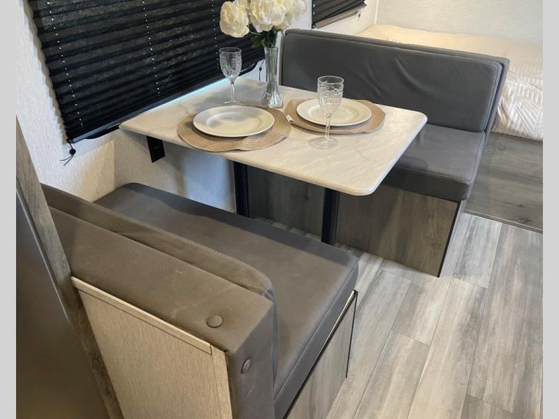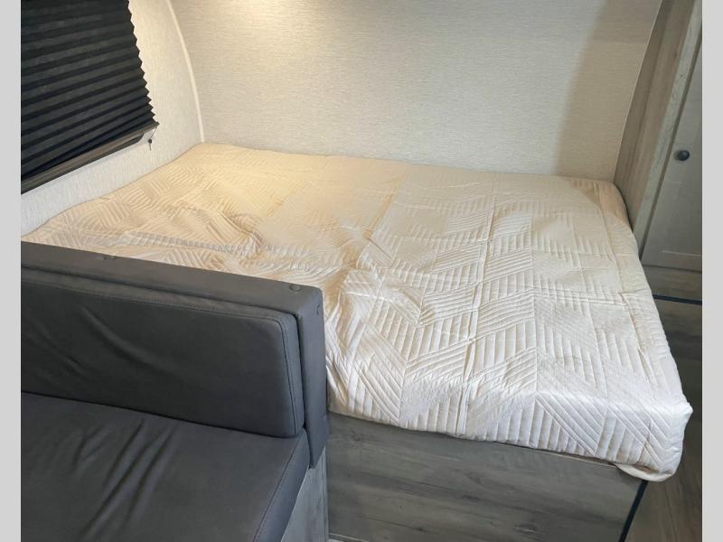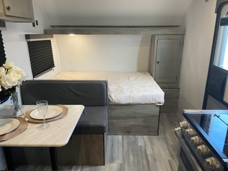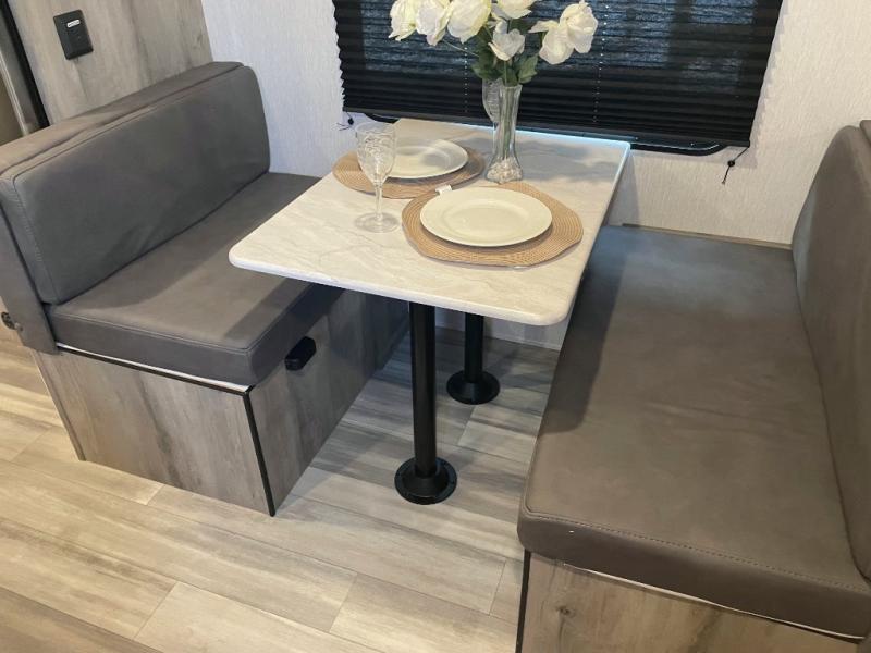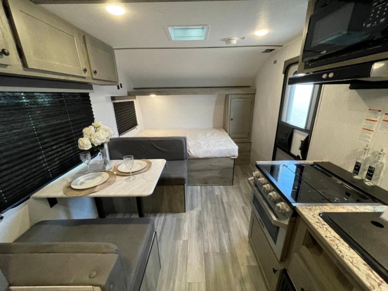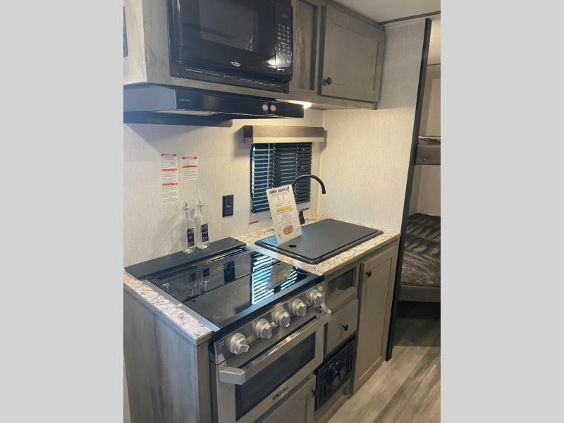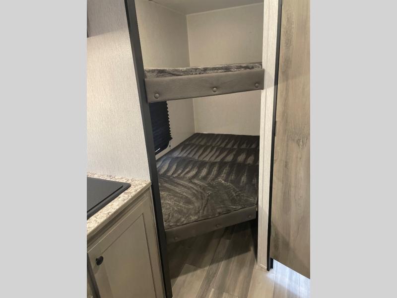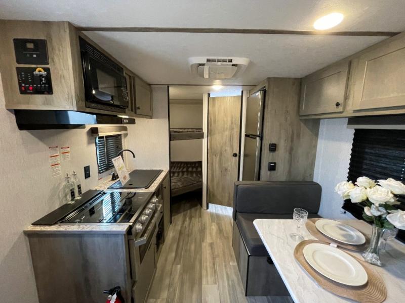 The perfect family-friendly travel trailer is found with this Sun Lite LTD model. You can take the front bed each night, while your guests or little ones take the double-size bunks towards the back. And if you're not needing the additional sleeping space, you can choose the desk option in place of the bunks. There is also a full bath right next to the bunks for easy nighttime use. The chef of your group can make meals using the three burner cooktop, and there is a double bowl sink for easy clean up. Once dinner has been cleaned up, you can play a game at the booth dinette, or head outdoors for an evening walk around the campground!