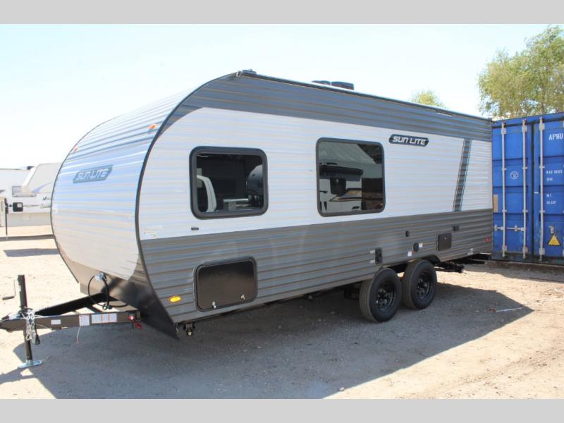 Each Sun Lite LTD travel trailer by Sunset Park RV is made with flexibility in mind. These lightweight models weigh under 3,000 lbs. for easy towing, and they offer best-in class interior storage for all your belongings. They are built with a one-piece PVC roof membrane and a durable rock guard that will help protect against rock and debris on the way to the campground. There is also an electric awning outside, along with a 100-watt solar kit, an outside shower, and more convenient features. You'll find a power roof vent in the bath, stylish window treatments, ball bearing drawer guides, and LED lights to name a few interior comforts.