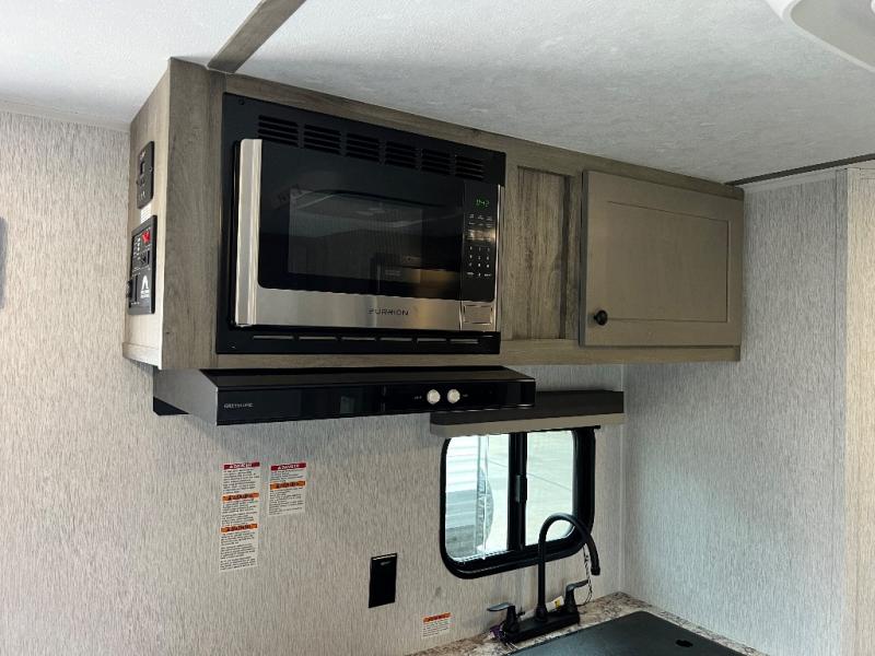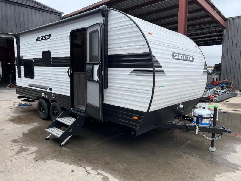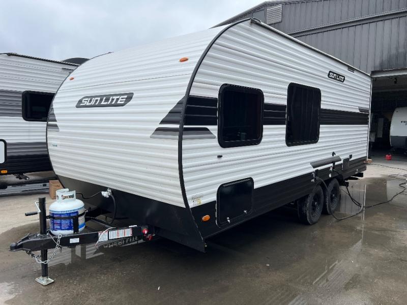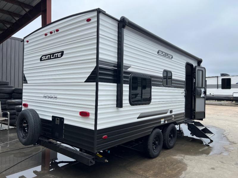 Each Sun Lite LTD travel trailer by Sunset Park RV is made with flexibility in mind. These lightweight models weigh under 3,000 lbs. for easy towing, and they offer best-in class interior storage for all your belongings. They are built with a one-piece PVC roof membrane and a durable rock guard that will help protect against rock and debris on the way to the campground. There is also an electric awning outside, along with a 100-watt solar kit, an outside shower, and more convenient features. You'll find a power roof vent in the bath, stylish window treatments, ball bearing drawer guides, and LED lights to name a few interior comforts.