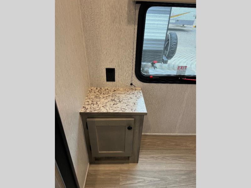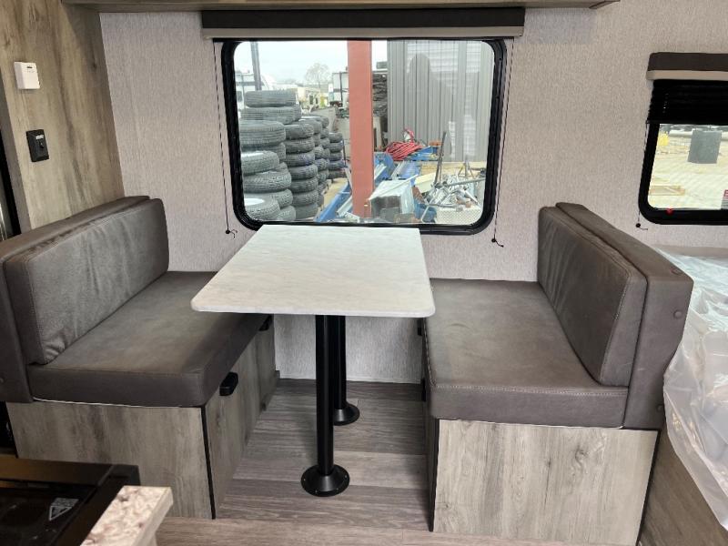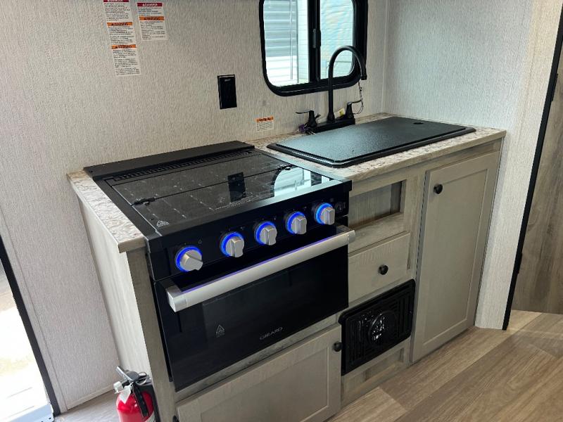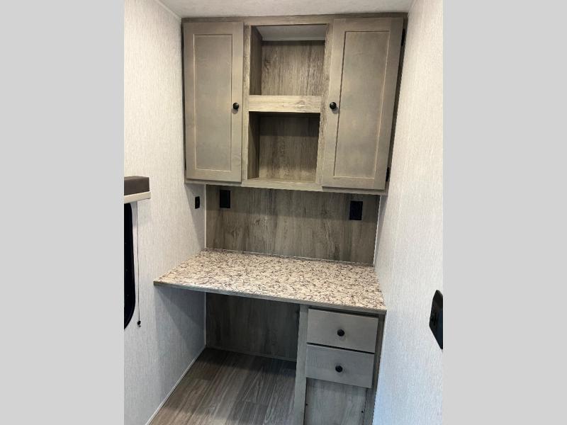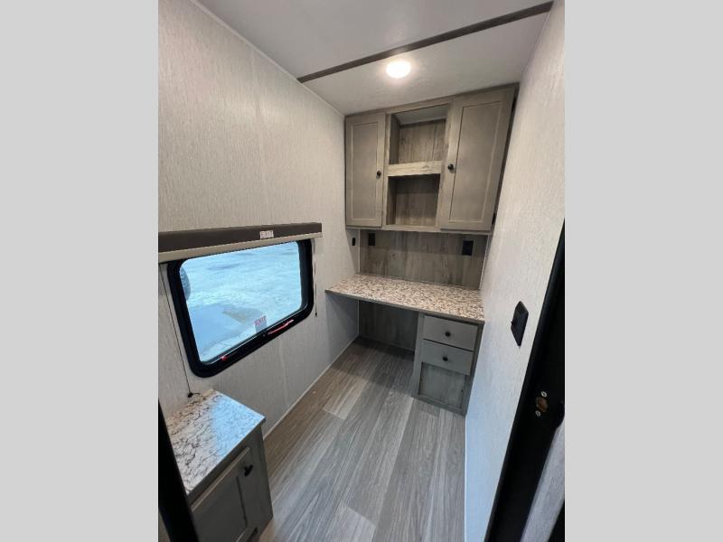 The perfect family-friendly travel trailer is found with this Sun Lite LTD model. You can take the front bed each night, while your guests or little ones take the double-size bunks towards the back. And if you're not needing the additional sleeping space, you can choose the desk option in place of the bunks. There is also a full bath right next to the bunks for easy nighttime use. The chef of your group can make meals using the three burner cooktop, and there is a double bowl sink for easy clean up. Once dinner has been cleaned up, you can play a game at the booth dinette, or head outdoors for an evening walk around the campground!