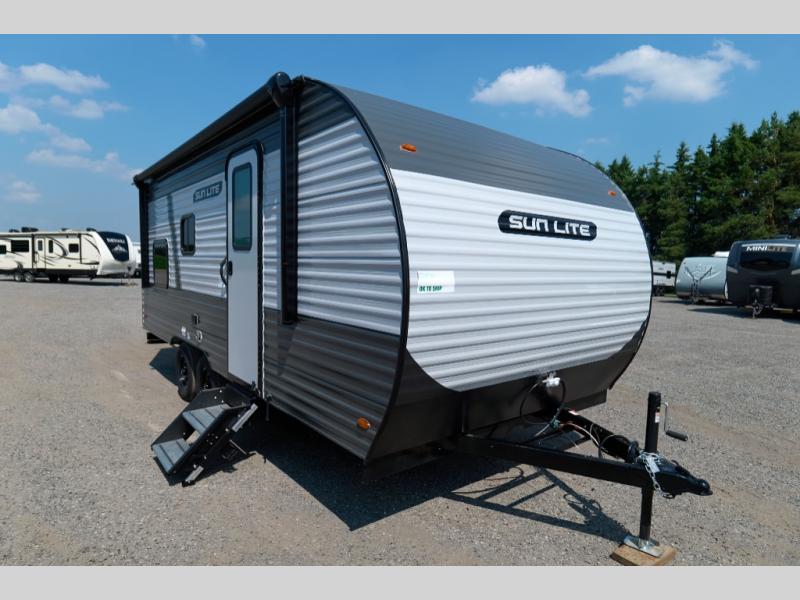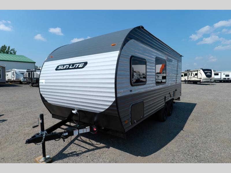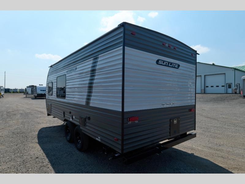 Each Sun Lite LTD travel trailer is designed for lightweight towing, weighing under 3,000 lbs. These trailers offer impressive storage space, a durable one-piece PVC roof membrane, and a rock guard to protect against debris on your journey. Additional features include a 100-watt solar kit, an outdoor shower, and a power roof vent in the bath. Inside, you'll find stylish window treatments, ball-bearing drawer guides, and LED lighting, all adding up to a truly comfortable experience on the road.