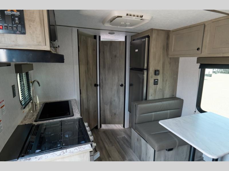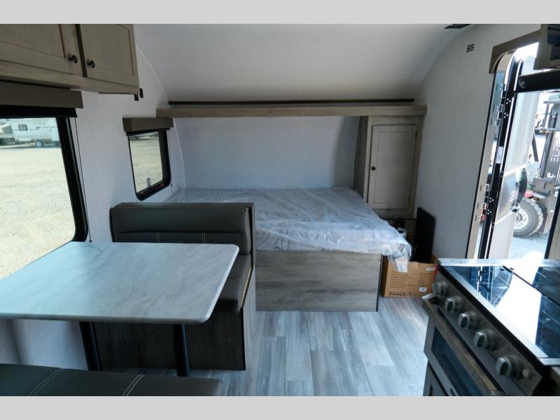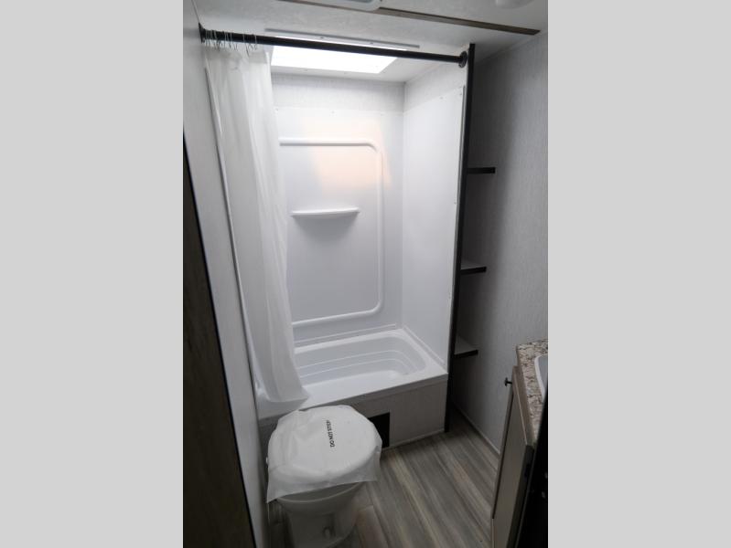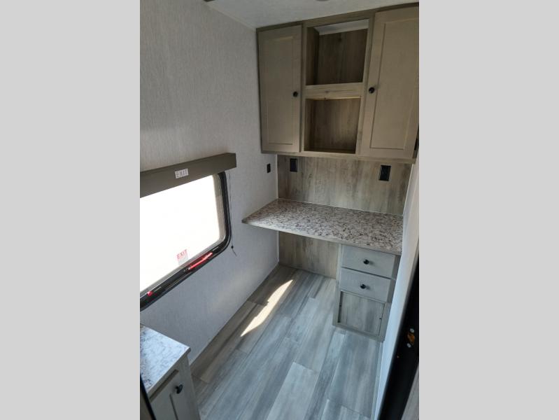 This Sun Lite LTD model is the ideal choice for those looking for a compact, functional travel trailer with a flexible living space. You can enjoy a comfortable front bed each night, and instead of double-size bunks, you have a dedicated office area for work or extra storage. Perfect for digital nomads, remote workers, or anyone who wants a bit more flexibility on the road. Just behind the office, you'll find a full bath for convenience, whether you're getting ready for the day or winding down at night.