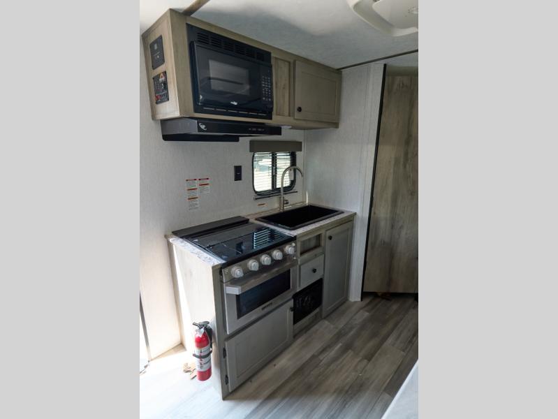 Cooking meals is easy with the three-burner cooktop, and cleanup is a breeze with the double-bowl sink. After dinner, you can gather around the booth dinette for a game or relax outdoors under the electric awning while enjoying a walk through the campground.
