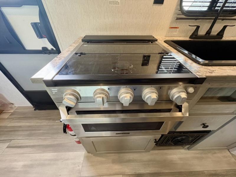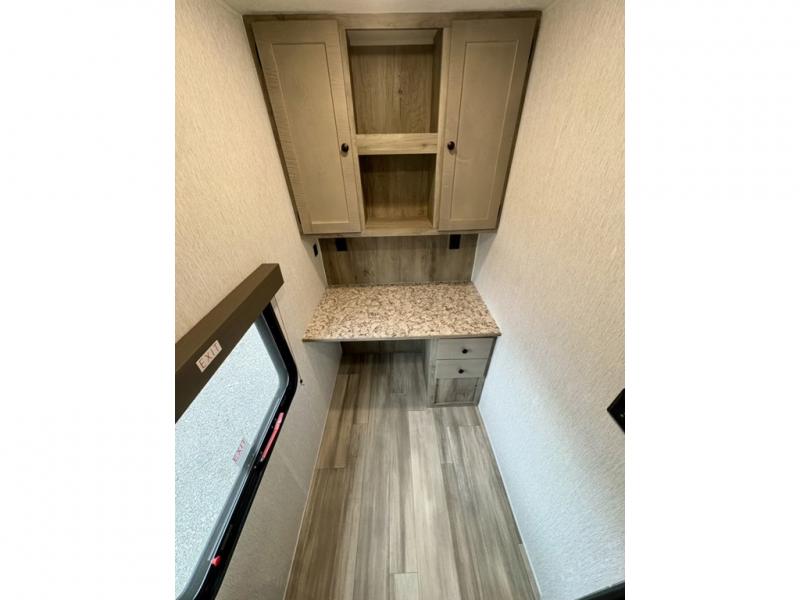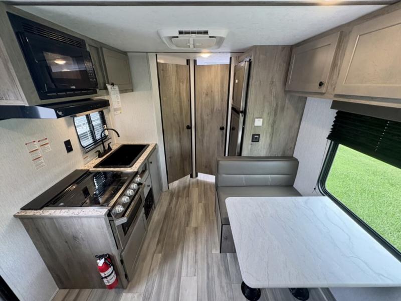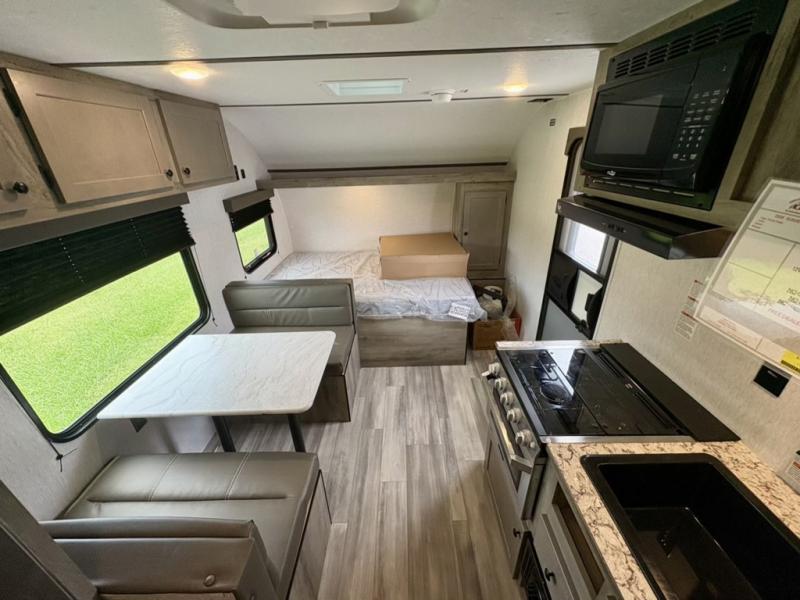 The perfect family-friendly travel trailer is found with this Sun Lite LTD model. You can take the front bed each night, while your guests or little ones take the double-size bunks towards the back. And if you're not needing the additional sleeping space, you can choose the desk option in place of the bunks. There is also a full bath right next to the bunks for easy nighttime use. The chef of your group can make meals using the three burner cooktop, and there is a double bowl sink for easy clean up. Once dinner has been cleaned up, you can play a game at the booth dinette, or head outdoors for an evening walk around the campground!