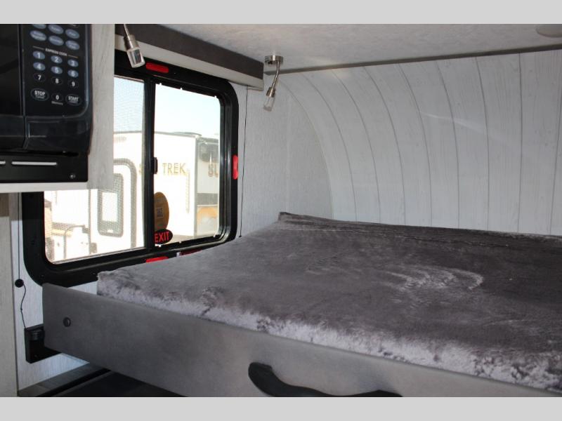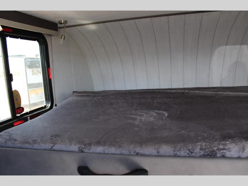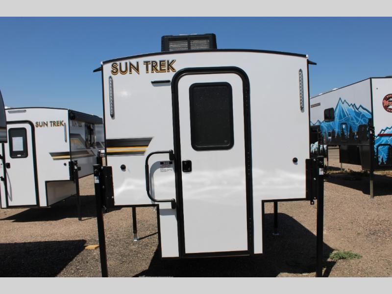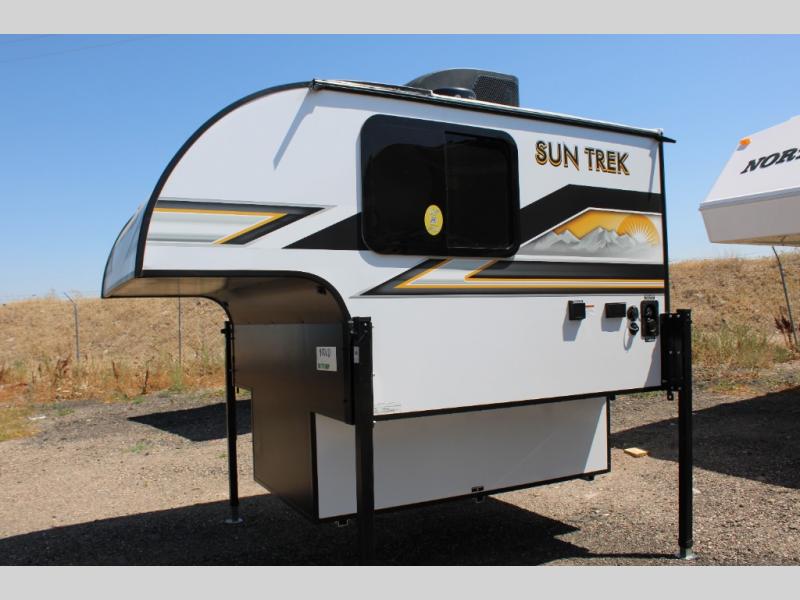 With any Sun Trek truck camper by Sunset Park RV, you will find a durable camper made to last thanks to the vacuum bonded laminated sidewalls and one-piece PVC roof membrane. You will also appreciate your choice of white or gray sidewalls, plus there are manual jacks outside and a 100-watt solar panel for some off-grid power. Inside, a power roof vent will help keep air moving, and you can choose an optional roof A/C if you enjoy camping in the summertime. Additional interior comforts include LED lights, tinted windows and solid surface countertops with a sink cover!