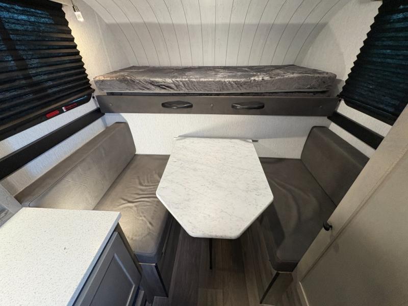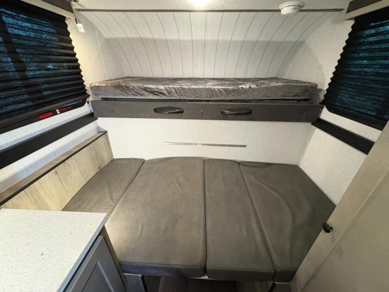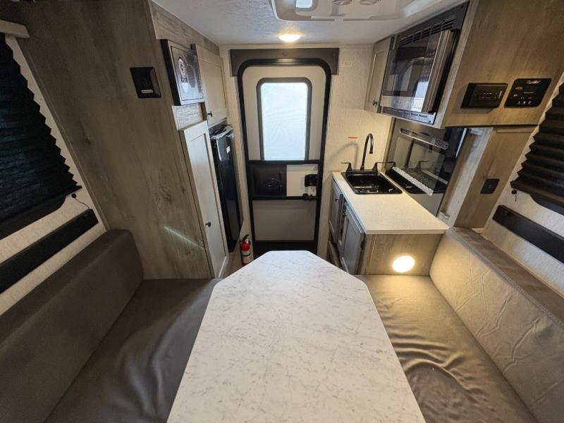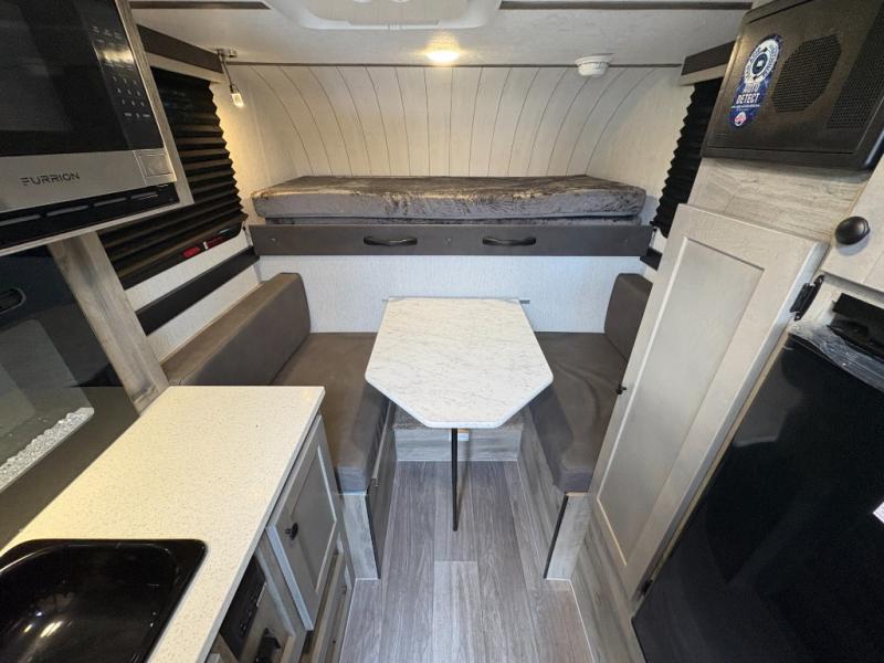 This truck camper is simple and to the point! You'll have somewhere to rest your head each night thanks to the front bed and booth dinette that will double as both seating and sleeping space. Once you've made dinner on your own outdoor grill, you can wash up using the indoor sink, and there is counter space here also. You'll appreciate the added safety features that include a smoke detector, fire extinguisher, and a C/O detector.