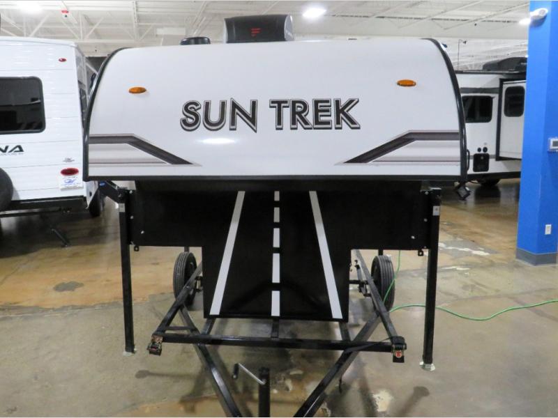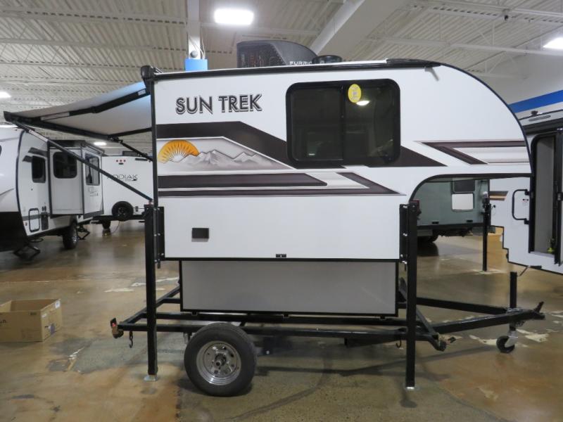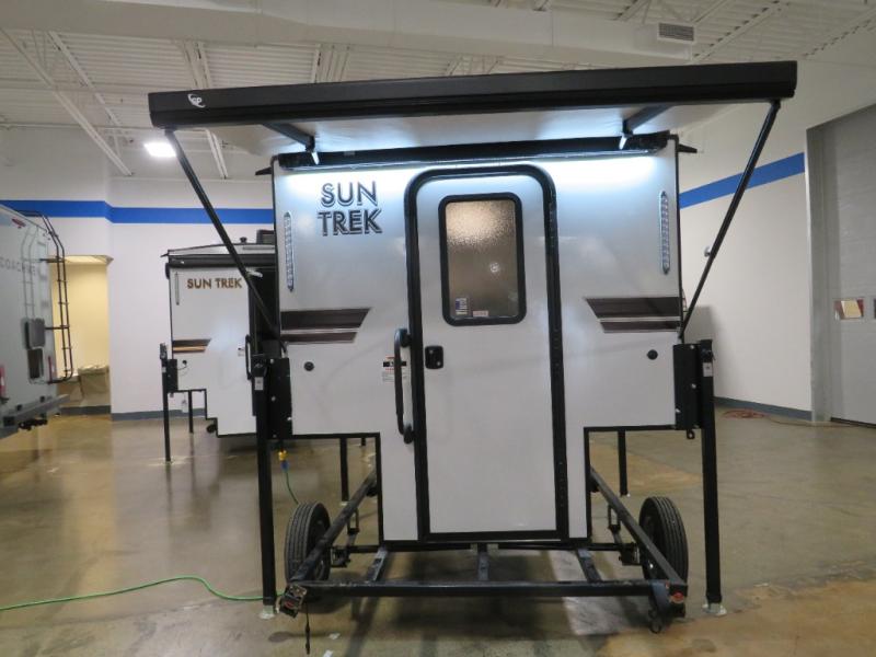 With any Sun Trek truck camper by Sunset Park RV, you will find a durable camper made to last thanks to the vacuum bonded laminated sidewalls and one-piece PVC roof membrane. You will also appreciate your choice of white or gray sidewalls, plus there are manual jacks outside and a 100-watt solar panel for some off-grid power. Inside, a power roof vent will help keep air moving, and you can choose an optional roof A/C if you enjoy camping in the summertime. Additional interior comforts include LED lights, tinted windows and solid surface countertops with a sink cover!