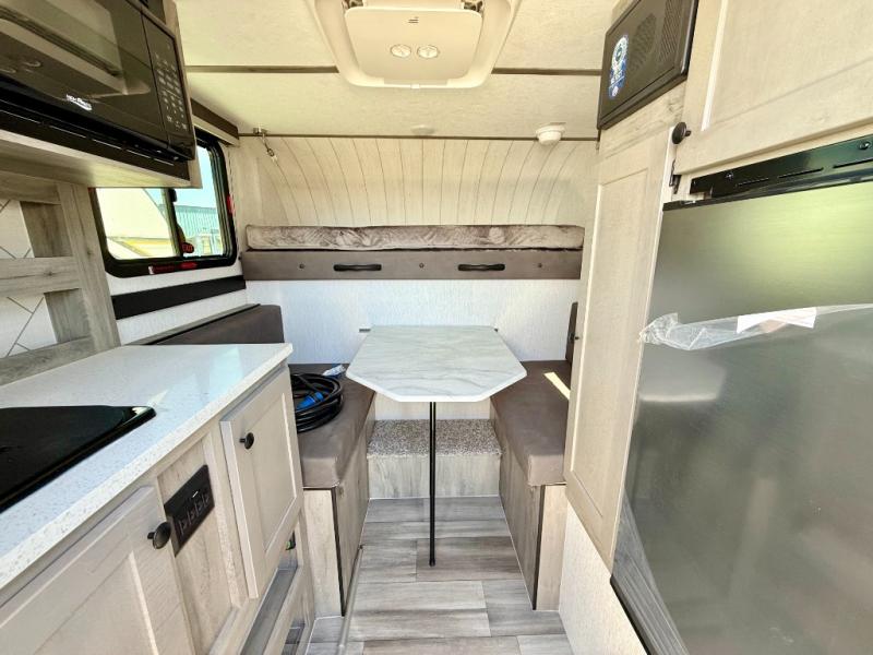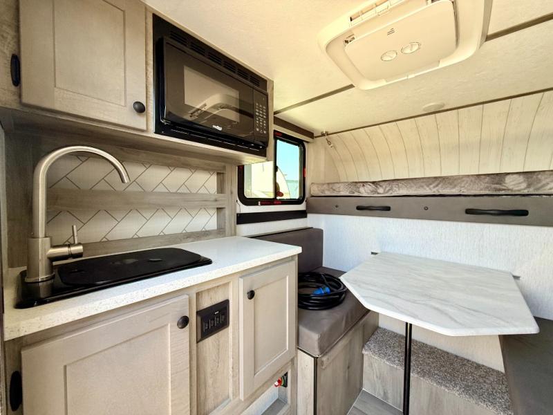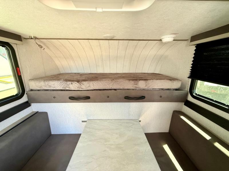This truck camper is simple and to the point! You'll have somewhere to rest your head each night thanks to the front bed and booth dinette that will double as both seating and sleeping space. Once you've made dinner on your own outdoor grill, you can wash up using the indoor sink, and there is counter space here also. You'll appreciate the added safety features that include a smoke detector, fire extinguisher, and a C/O detector.