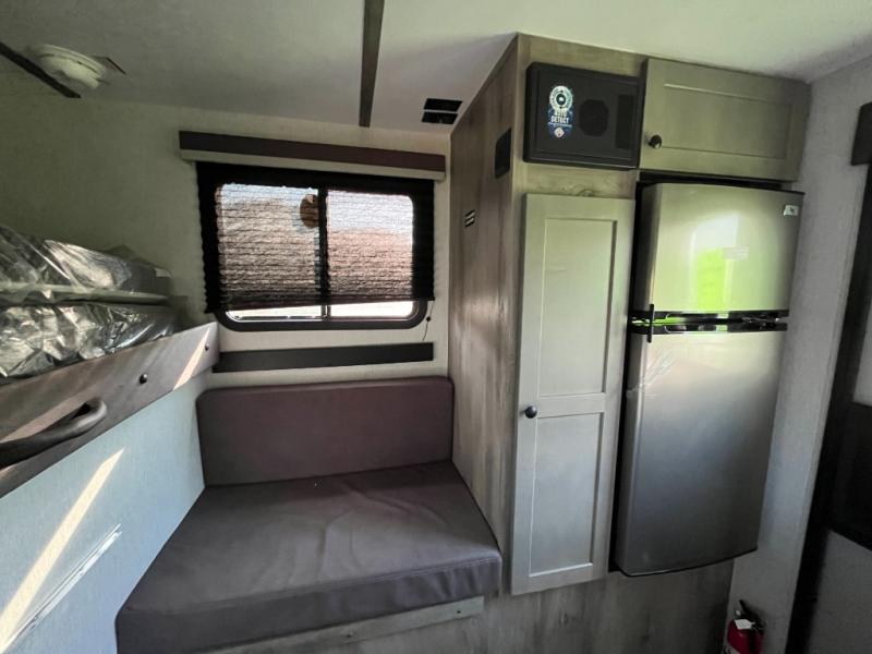 You're sure to find comfort in this truck camper for two! The front bed provides a great night's rest, and there is added seating at the foot of the bed and along the side. This unit also includes counter space, a sink to wash up and a 4.5 12V refrigerator to keep food fresh.