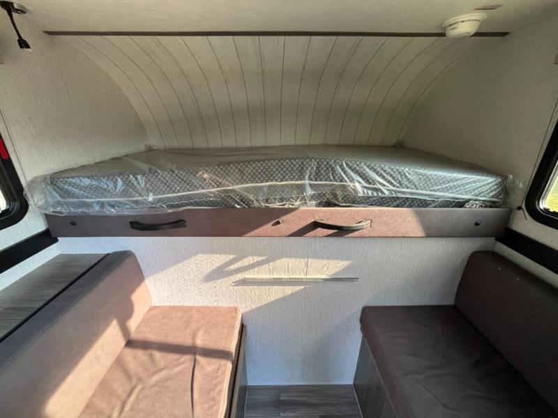 You're sure to find comfort in this truck camper for two! The front bed provides a great night's rest, and there is added seating at the foot of the bed and along the side. This unit also includes counter space, a sink to wash up and a 4.5 12V refrigerator to keep food fresh.