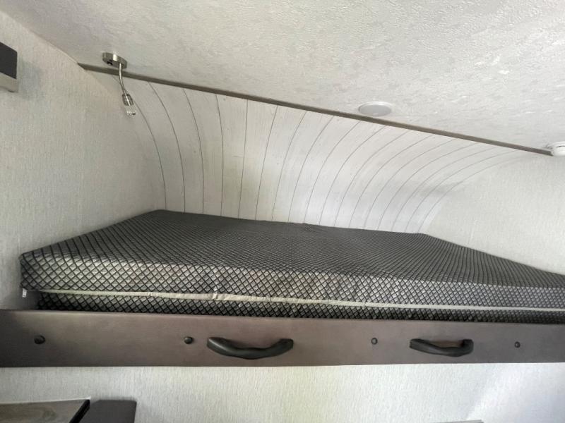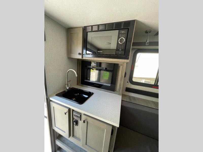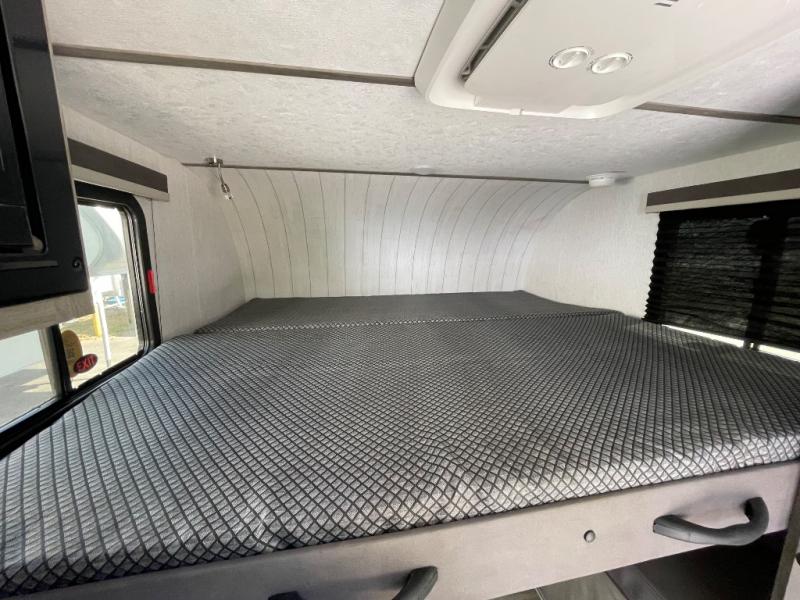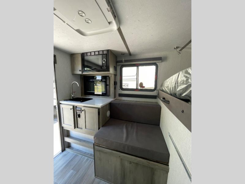 With any Sun Trek truck camper by Sunset Park RV, you will find a durable camper made to last thanks to the vacuum bonded laminated sidewalls and one-piece PVC roof membrane. You will also appreciate your choice of white or gray sidewalls, plus there are manual jacks outside and a 100-watt solar panel for some off-grid power. Inside, a power roof vent will help keep air moving, and you can choose an optional roof A/C if you enjoy camping in the summertime. Additional interior comforts include LED lights, tinted windows and solid surface countertops with a sink cover!