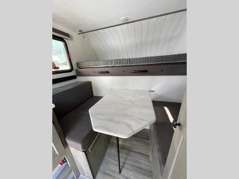 You're sure to find comfort in this truck camper for two! The front bed provides a great night's rest, and there is added seating at the foot of the bed and along the side. And a convenient toilet will let you skip the camp's facilities in the middle of the night. This unit also includes counter space, a sink to wash up and a 4.5 12V refrigerator to keep food fresh.