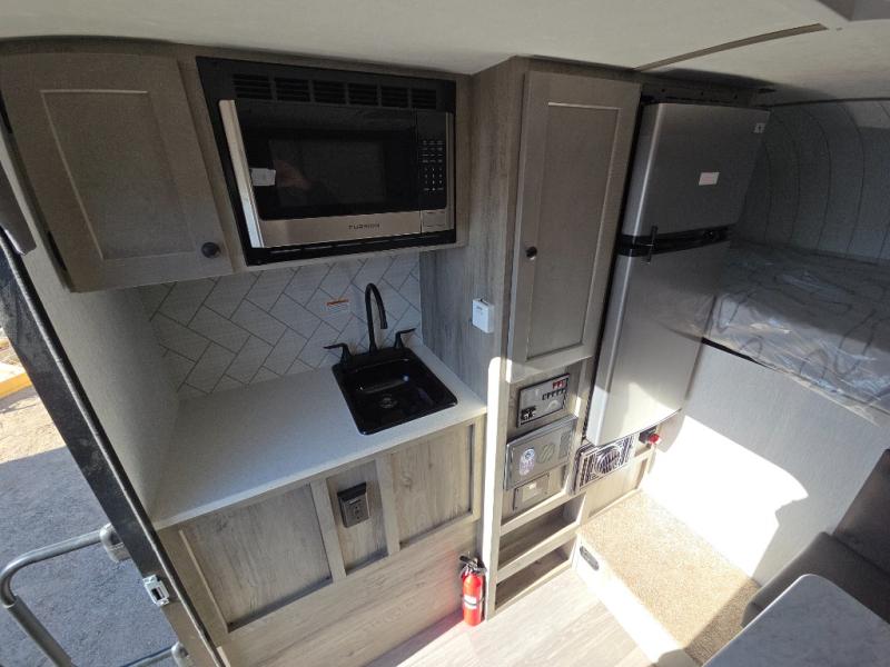With any Sun Trek truck camper by Sunset Park RV, you will find a durable camper made to last thanks to the vacuum bonded laminated sidewalls and one-piece PVC roof membrane. You will also appreciate your choice of white or gray sidewalls, plus there are manual jacks outside and a 100-watt solar panel for some off-grid power. Inside, a power roof vent will help keep air moving, and you can choose an optional roof A/C if you enjoy camping in the summertime. Additional interior comforts include LED lights, tinted windows and solid surface countertops with a sink cover!