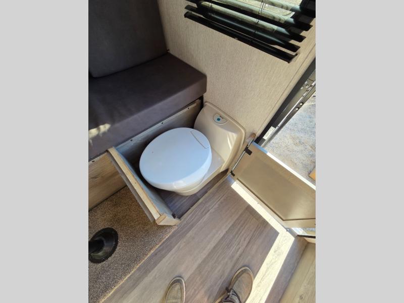 You're sure to find comfort in this truck camper for two! The front bed provides a great night's rest, and there is added seating at the foot of the bed and along the side. And a convenient toilet will let you skip the camp's facilities in the middle of the night. This unit also includes counter space, a sink to wash up and a 4.5 12V refrigerator to keep food fresh.