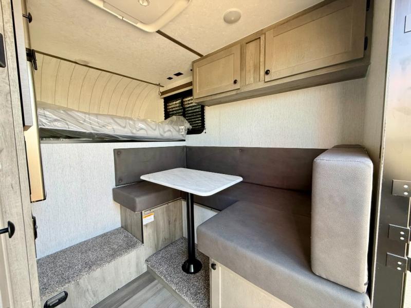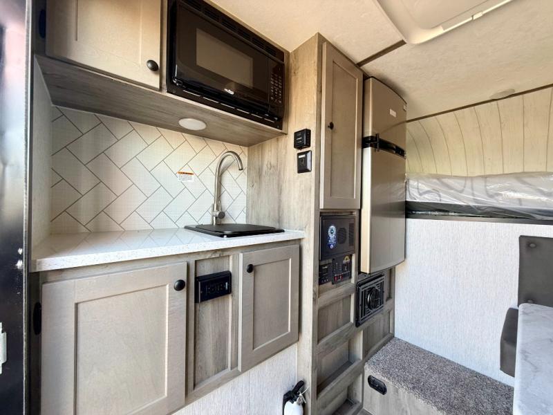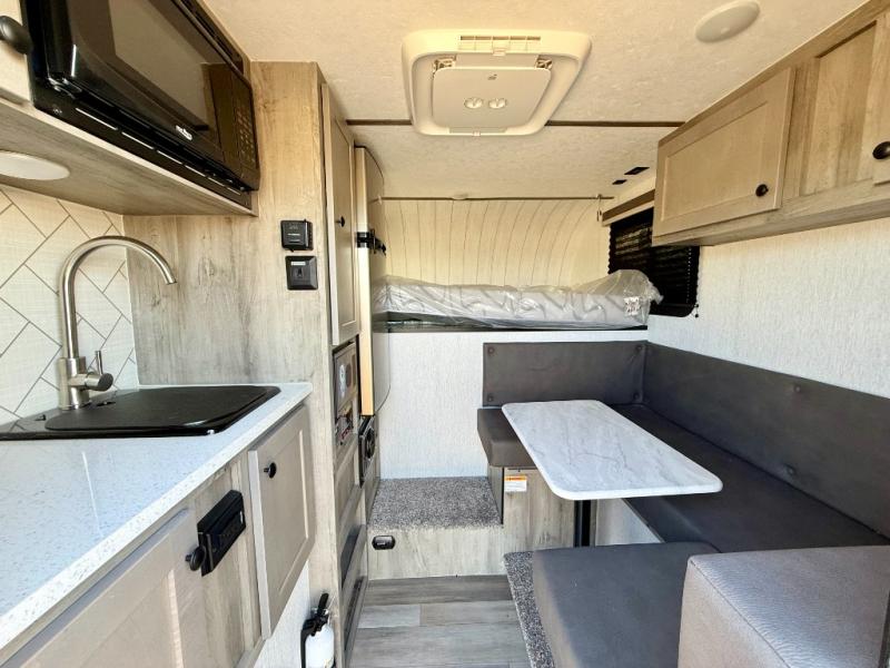 With any Sun Trek truck camper by Sunset Park RV, you will find a durable camper made to last thanks to the vacuum bonded laminated sidewalls and one-piece PVC roof membrane. You will also appreciate your choice of white or gray sidewalls, plus there are manual jacks outside and a 100-watt solar panel for some off-grid power. Inside, a power roof vent will help keep air moving, and you can choose an optional roof A/C if you enjoy camping in the summertime. Additional interior comforts include LED lights, tinted windows and solid surface countertops with a sink cover!