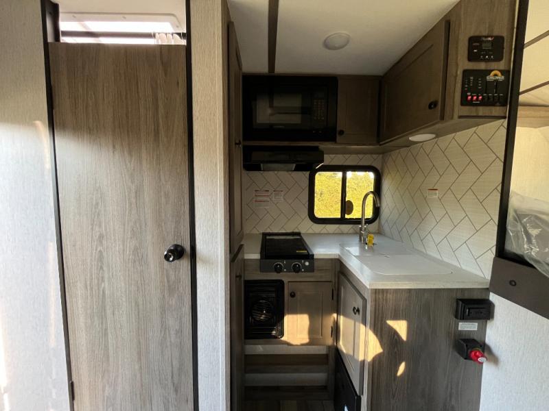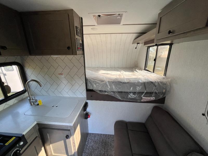 With any Sun Trek truck camper by Sunset Park RV, you will find a durable camper made to last thanks to the vacuum bonded laminated sidewalls and one-piece PVC roof membrane. You will also appreciate your choice of white or gray sidewalls, plus there are manual jacks outside and a 100-watt solar panel for some off-grid power. Inside, a power roof vent will help keep air moving, and you can choose an optional roof A/C if you enjoy camping in the summertime. Additional interior comforts include LED lights, tinted windows and solid surface countertops with a sink cover!