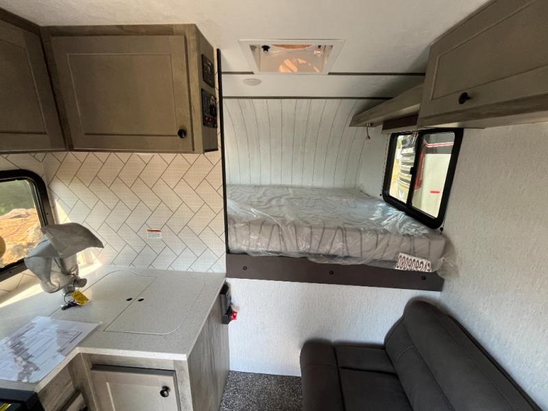 With any Sun Trek truck camper by Sunset Park RV, you will find a durable camper made to last thanks to the vacuum bonded laminated sidewalls and one-piece PVC roof membrane. You will also appreciate your choice of white or gray sidewalls, plus there are manual jacks outside and a 100-watt solar panel for some off-grid power. Inside, a power roof vent will help keep air moving, and you can choose an optional roof A/C if you enjoy camping in the summertime. Additional interior comforts include LED lights, tinted windows and solid surface countertops with a sink cover!