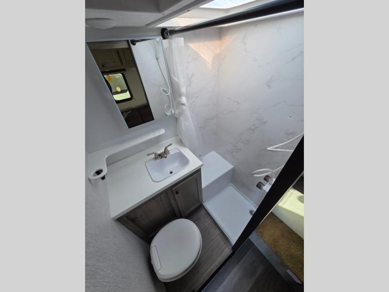 With any Sun Trek truck camper by Sunset Park RV, you will find a durable camper made to last thanks to the vacuum bonded laminated sidewalls and one-piece PVC roof membrane. You will also appreciate your choice of white or gray sidewalls, plus there are manual jacks outside and a 100-watt solar panel for some off-grid power. Inside, a power roof vent will help keep air moving, and you can choose an optional roof A/C if you enjoy camping in the summertime. Additional interior comforts include LED lights, tinted windows and solid surface countertops with a sink cover!