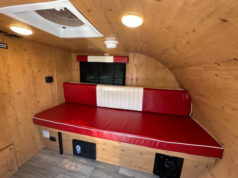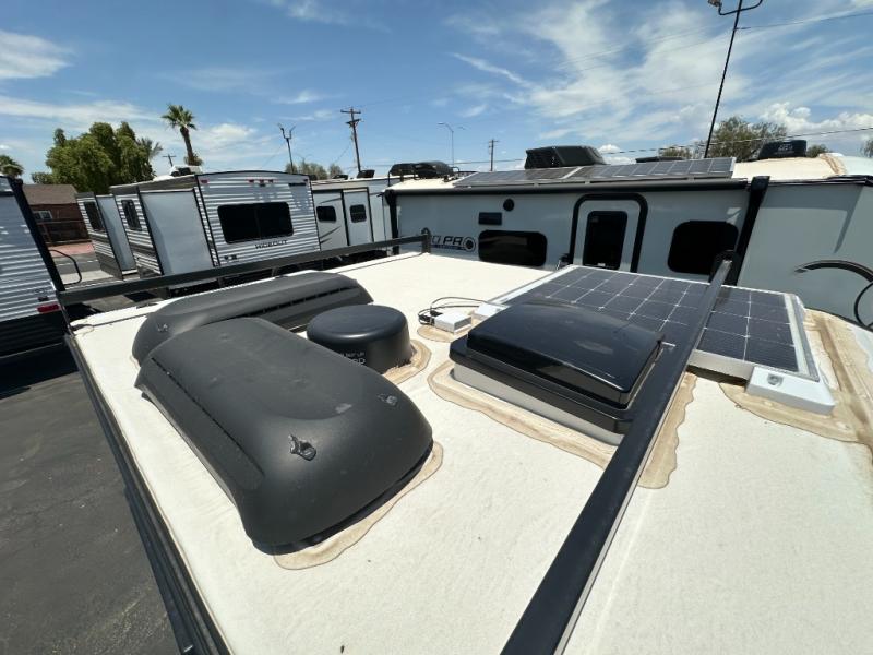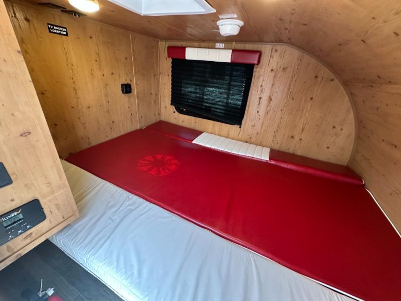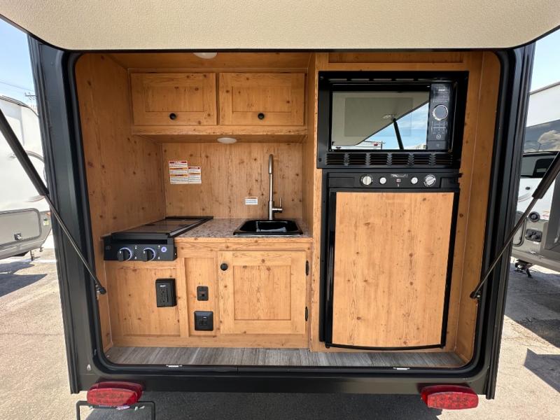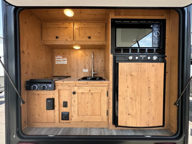 This Sunray travel trailer with its 12' length and 1,320-LB dry weight, is simple to navigate. You have most of the basic essentials without needing to tow all of the extra weight. There is an outdoor kitchen that comes with a two-burner stove top, a refrigerator, and a microwave so that you can cook dinner without having to start a fire. You will have an outside shower that you can use for various purposes, like rinsing off your equipment, filling a bucket with water, or hosing down your muddy puppy, and there are USB ports and a Winegard HDTV antenna to keep you modern.