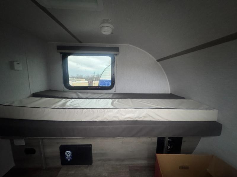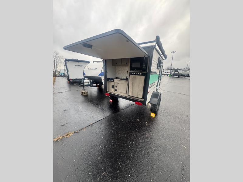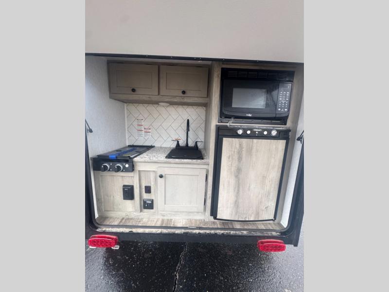 This Sunray travel trailer with its 12' length and 1,320-LB dry weight, is simple to navigate. You have most of the basic essentials without needing to tow all of the extra weight. There is an outdoor kitchen that comes with a two-burner stove top, a refrigerator, and a microwave so that you can cook dinner without having to start a fire. You will have an outside shower that you can use for various purposes, like rinsing off your equipment, filling a bucket with water, or hosing down your muddy puppy, and there are USB ports and a Winegard HDTV antenna to keep you modern.