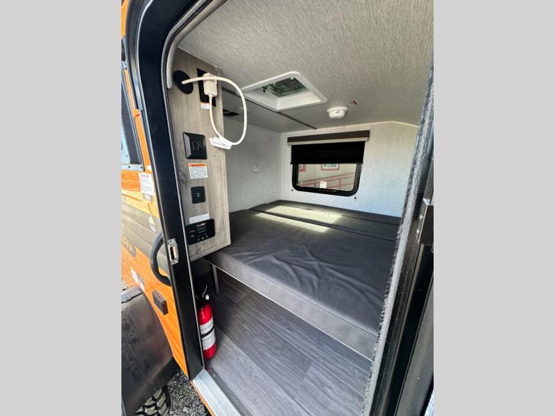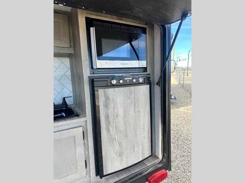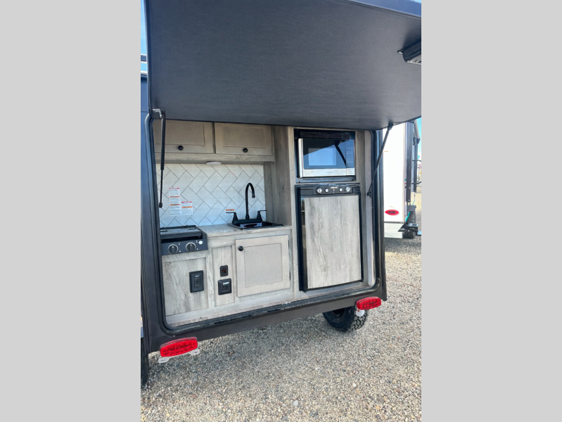 This Sunray travel trailer with its 12' length and 1,320-LB dry weight, is simple to navigate. You have most of the basic essentials without needing to tow all of the extra weight. There is an outdoor kitchen that comes with a two-burner stove top, a refrigerator, and a microwave so that you can cook dinner without having to start a fire. You will have an outside shower that you can use for various purposes, like rinsing off your equipment, filling a bucket with water, or hosing down your muddy puppy, and there are USB ports and a Winegard HDTV antenna to keep you modern.