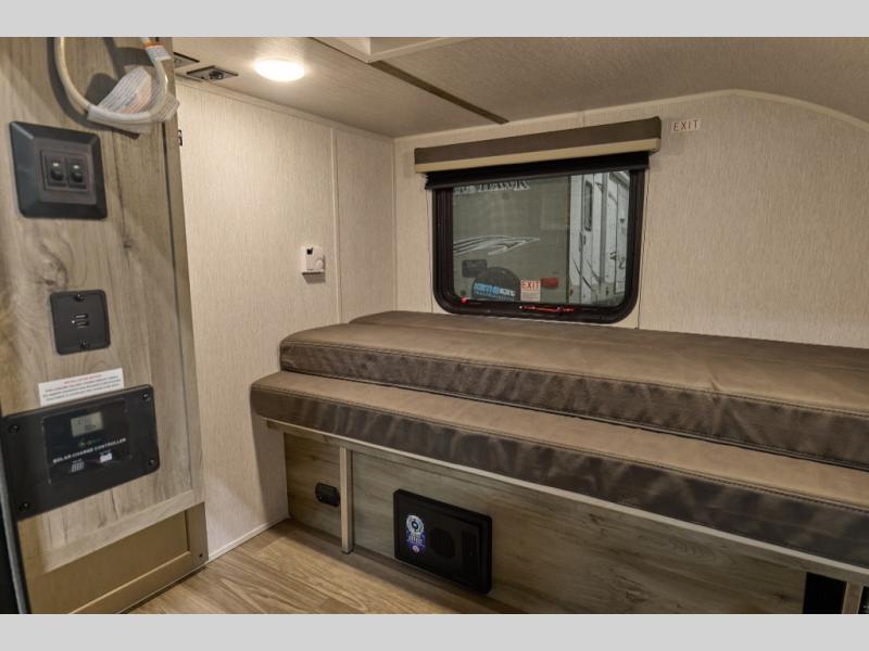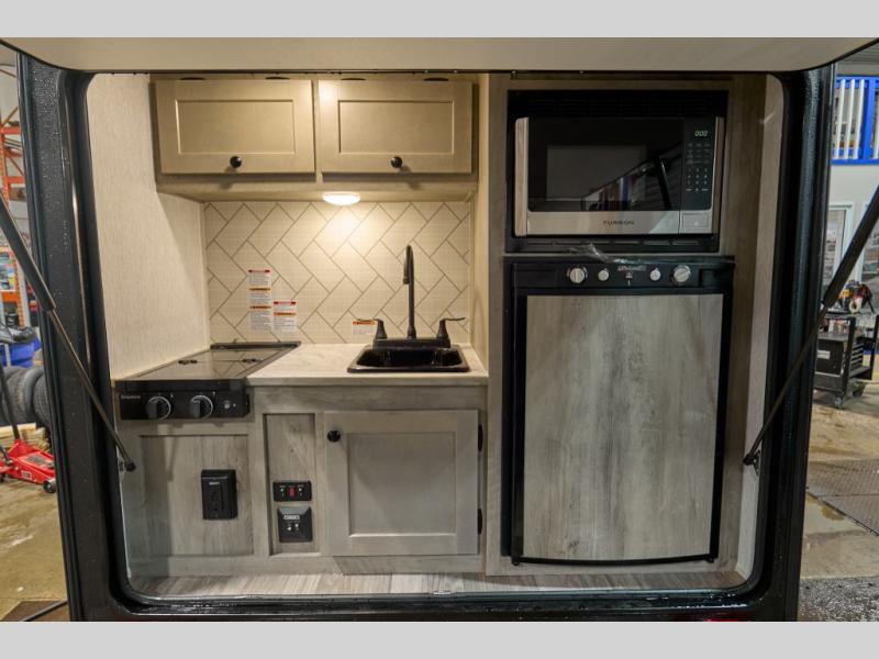 This Sunray travel trailer with its 12' length and 1,320-LB dry weight, is simple to navigate. You have most of the basic essentials without needing to tow all of the extra weight. There is an outdoor kitchen that comes with a two-burner stove top, a refrigerator, and a microwave so that you can cook dinner without having to start a fire. You will have an outside shower that you can use for various purposes, like rinsing off your equipment, filling a bucket with water, or hosing down your muddy puppy, and there are USB ports and a Winegard HDTV antenna to keep you modern.