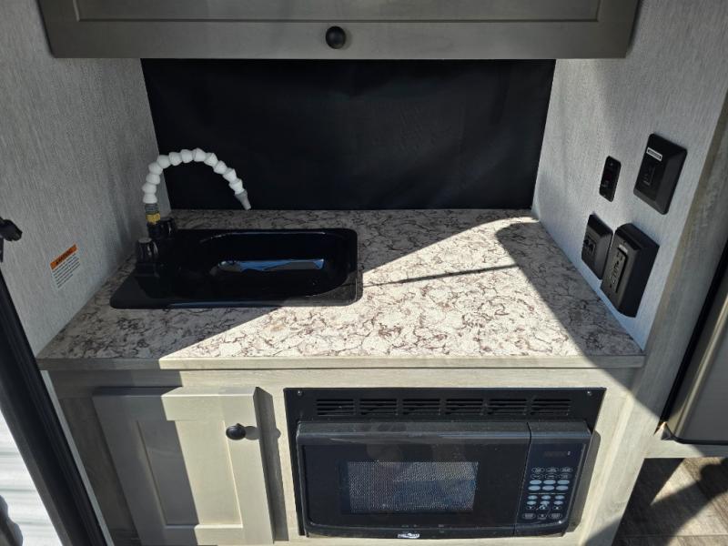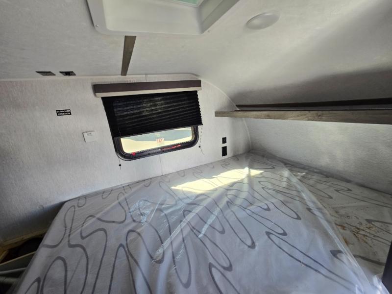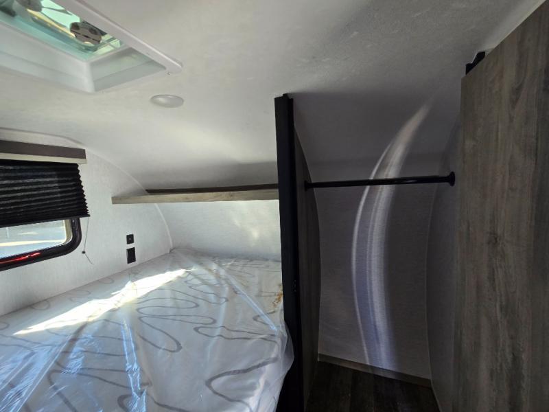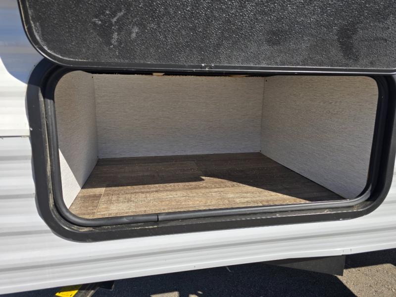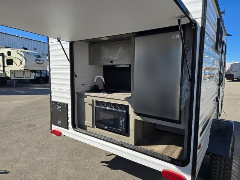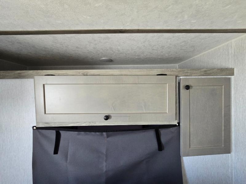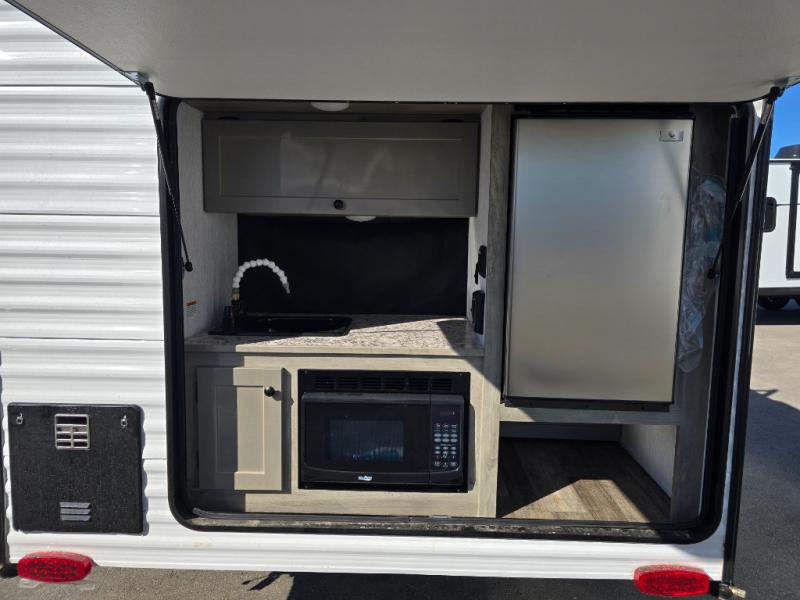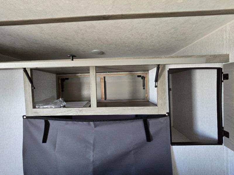 This unit is ideal for travelers seeking maneuverability and ease of towing without compromising on essential comforts. The rear closet provides convenient storage for clothing and personal items, keeping your belongings organized, and the bed assembly creates a cozy sleeping space, perfect for restful nights on the road. Practical storage and organization can be found in the front closet, which offers additional storage for travel essentials and personal belongings, while the front shelf delivers handy space for items you want within easy reach, enhancing convenience. Further, the A/C cabinet provides specialized storage for your air conditioning unit, ensuring efficient integration and protection. Convenience is met in the outdoor kitchen, which features a refrigerator, overhead cabinets, and a two-burner cooktop, providing versatile cooking options for preparing delicious meals outdoors.