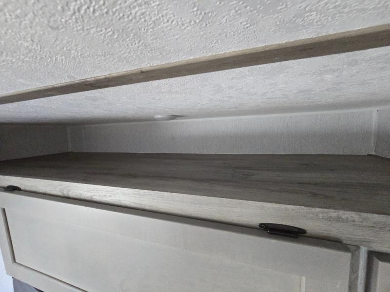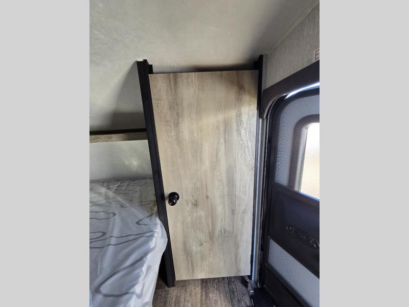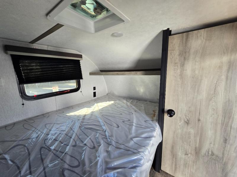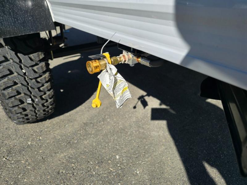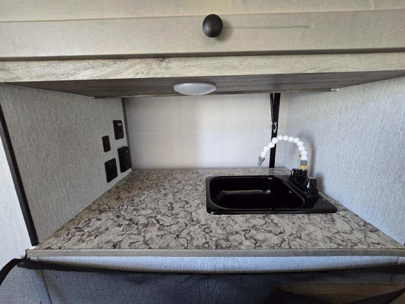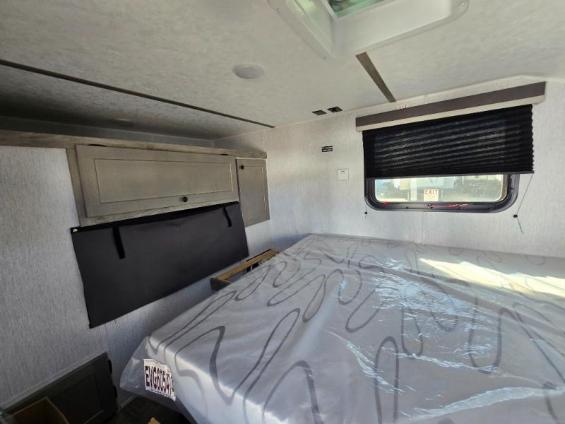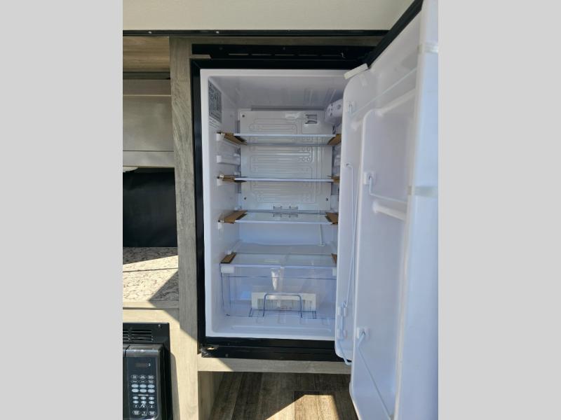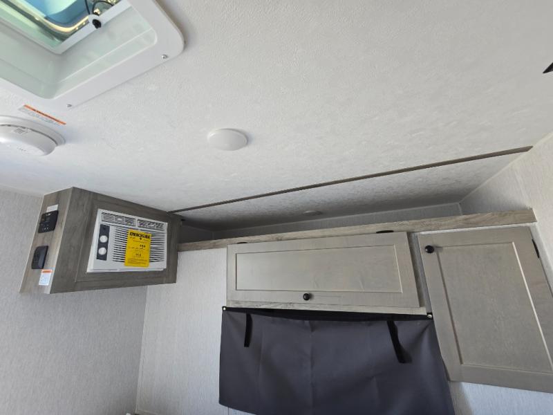 This unit is ideal for travelers seeking maneuverability and ease of towing without compromising on essential comforts. The rear closet provides convenient storage for clothing and personal items, keeping your belongings organized, and the bed assembly creates a cozy sleeping space, perfect for restful nights on the road. Practical storage and organization can be found in the front closet, which offers additional storage for travel essentials and personal belongings, while the front shelf delivers handy space for items you want within easy reach, enhancing convenience. Further, the A/C cabinet provides specialized storage for your air conditioning unit, ensuring efficient integration and protection. Convenience is met in the outdoor kitchen, which features a refrigerator, overhead cabinets, and a two-burner cooktop, providing versatile cooking options for preparing delicious meals outdoors.